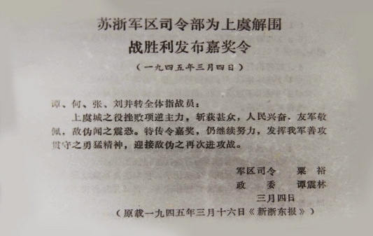 3月4日,苏浙军区司令粟裕、政委谭震林传令嘉奖,庆贺上虞解围战胜利。