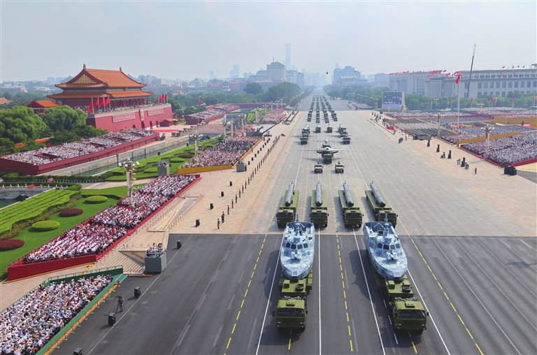 战旗猎猎,铁流滚滚。80面抗战英模部队荣誉旗帜组成的战旗方队,承载着历史荣光浩荡而来。这些英雄的旗帜、胜利的旗帜、不朽的旗帜,激励着人民军队勇往直前。装备方队编组陆上作战群、海上作战群、防空反导群、信息作战群、无人作战群、后装保障群、战略打击群隆隆驶来,接受检阅。新型坦克、无人智能、网电作战、高超声速、防空反导、战略导弹……从抗战时期土枪土炮到今天新型作战力量,国产现役主战装备和战略重器在天安门城楼前一一通过,展示坚决捍卫国家主权安全发展利益、坚定维护世界和平的钢铁意志和强大实力。