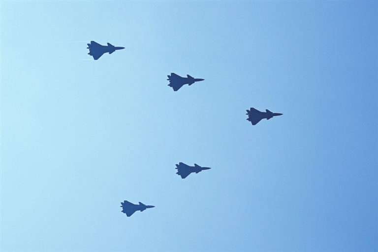 战鹰呼啸,振翅长空。预警指挥机、特种机、运输机、轰炸机、加受油机、歼击机、舰载机等空中梯队依次低空飞过天安门广场,受阅的预警侦察、远程打击、制空作战、战略投送、支援保障等机型,成体系展示我军快速提升的空中作战能力。教练机梯队拉出14道彩烟,寓意着中华民族14年可歌可泣的抗战历程,象征着14亿多中国人民奔向强国复兴的光明前景。
