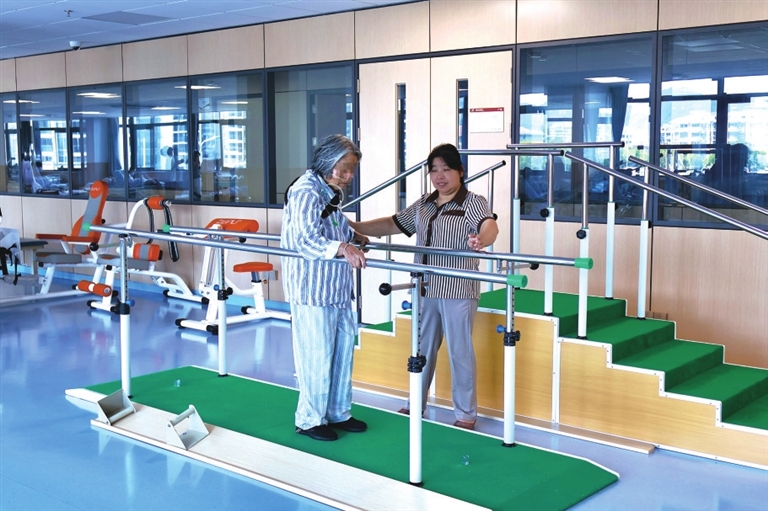 康复病房里,77岁的王大爷正借助助行器站立,试着缓缓向前。