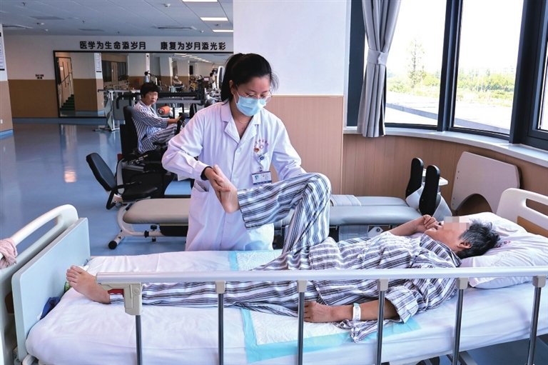 面对这位高龄患者,康复科医护团队没有退缩,而是借助中西医结合康复方案,每天帮他完成床边侧翻、臀桥、肢体摆动……唤醒肌肉,补回流失的力量;利用针灸、砭石通络等疏通经络,唤醒身体的感知。