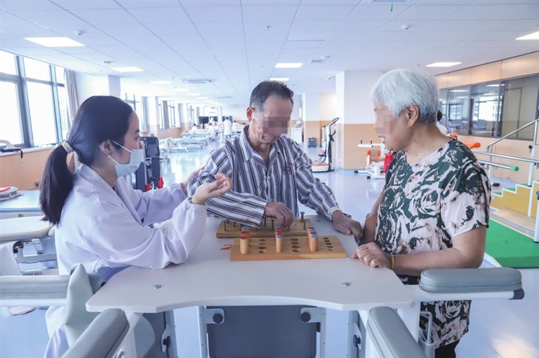 与王大爷一样,俞大妈每天的康复治疗时间也排得满满当当。除了高压氧治疗为生命赋氧,还得进行上下肢肌力训练、腰腹核心力量训练、坐位平衡训练、手指精细功能训练等,并接受针灸、温通、中药等中医药治疗为康复赋能。