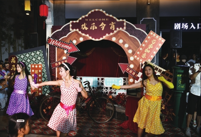 “那南风吹来清凉,那夜莺啼声细唱……”初秋晚上,《夜来香》的歌声悠扬地散落在“曹娥里·十三弄”历史文化街区。区文化馆党员干部徐梅莎一曲唱罢,《我只在乎你》《失恋阵线联盟》等怀旧金曲又逐一登场,引得现场游客热情合唱。更有甚者,换上年代感十足的怀旧“行头”,在音符中穿越,在放歌中抒情。话筒频频在游客间接龙传递,热闹的场面几度将“开心麻花”剧场所在的小弄堂围得水泄不通。