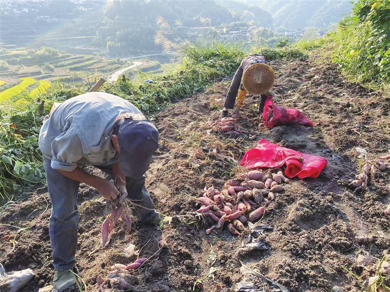 在覆卮山“冰川蜜薯共富基地”,番薯也迎来了丰收时刻。该基地依托覆卮山独特的高海拔气候、充沛的阳光资源、优良的生态环境,以及冰川石浪地质带来的特殊土壤条件,成功培育出具有地方特色的“冰川蜜薯”。