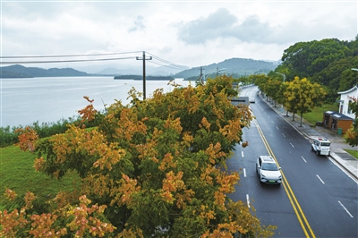 近日,皂李湖旁的黄潘公路两侧,栾树繁花满枝。金黄花朵与湖光山色相映,车辆行驶其间,宛如穿梭于美丽画卷,为秋日增添了一抹灵动的色彩。