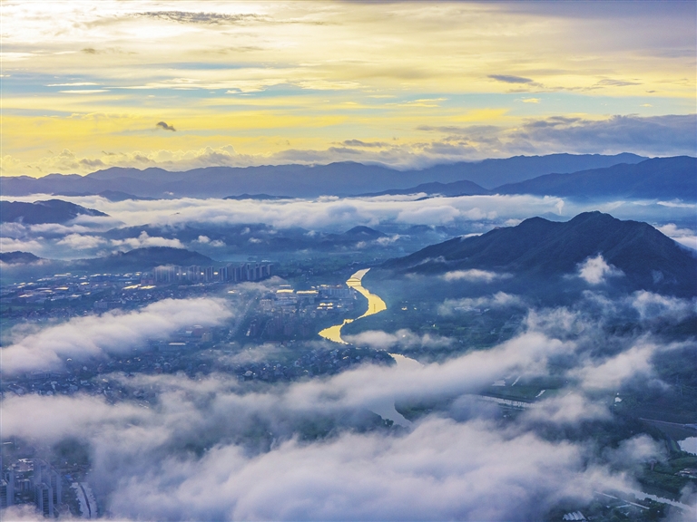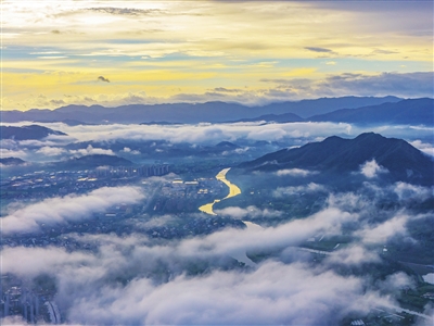 晨光穿透云层洒下,为云雾镀上柔光,市民驻足抓拍这难得的晨雾美景。