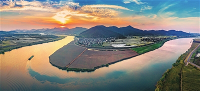 近日黄昏时分,落日余晖为曹娥江披上金色霓裳。江面波光粼粼,如碎金舞动,与江畔静谧的田园、错落的村庄交相辉映,构成一幅诗意盎然的秋日画卷。