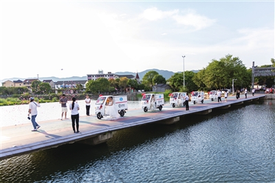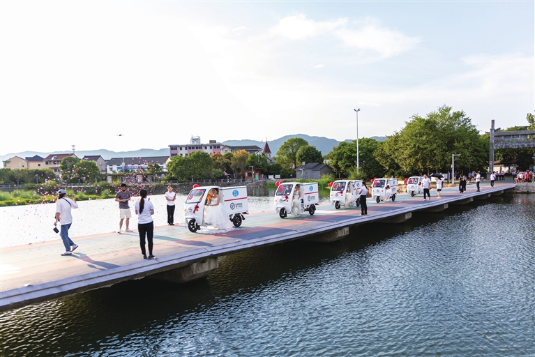 现场,5对身着礼服的快递新人驾驶着贴满大红“喜”字的快递三轮车,缓缓驶向波光粼粼的龙鳞坝。“我是新上虞人,老家安徽的,在崧厦街道送快递。今天这场特别的婚礼,让我们这些异乡人感受到了家的温暖。”顺丰小哥李新同和新娘夏敏思通过朋友介绍结缘,在上虞展开了美好的姻缘。今年7月,李新同在丁宅壹丢丢水上音乐节上向夏敏思求婚,看到当地美丽的山水风光,双方决定在此举办婚礼。
