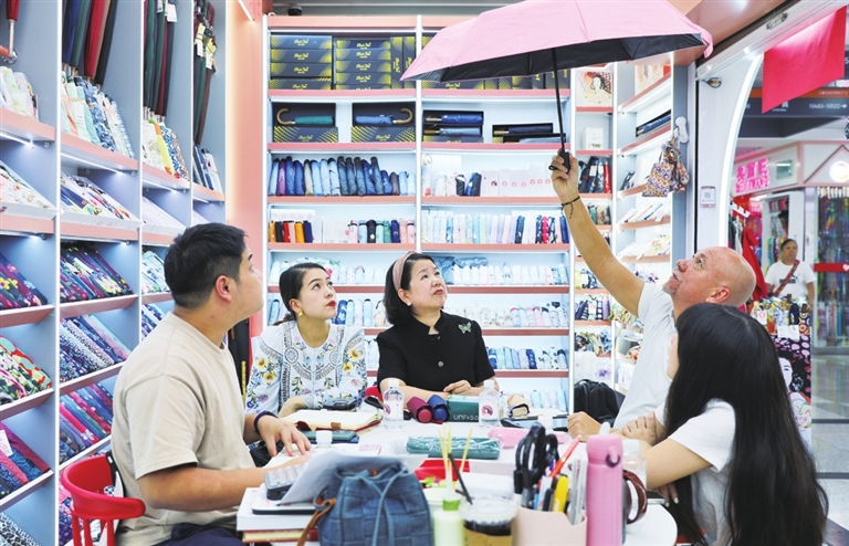“Welcome to my shop,this umbrella has very good quality!”昨天上午,在义乌国际商贸城二区的星宝伞业店铺里,上虞人张吉英用英语向来自哥伦比亚的客商Juan Pecoso介绍最新款的雨伞。听完介绍,Juan爽快下单。