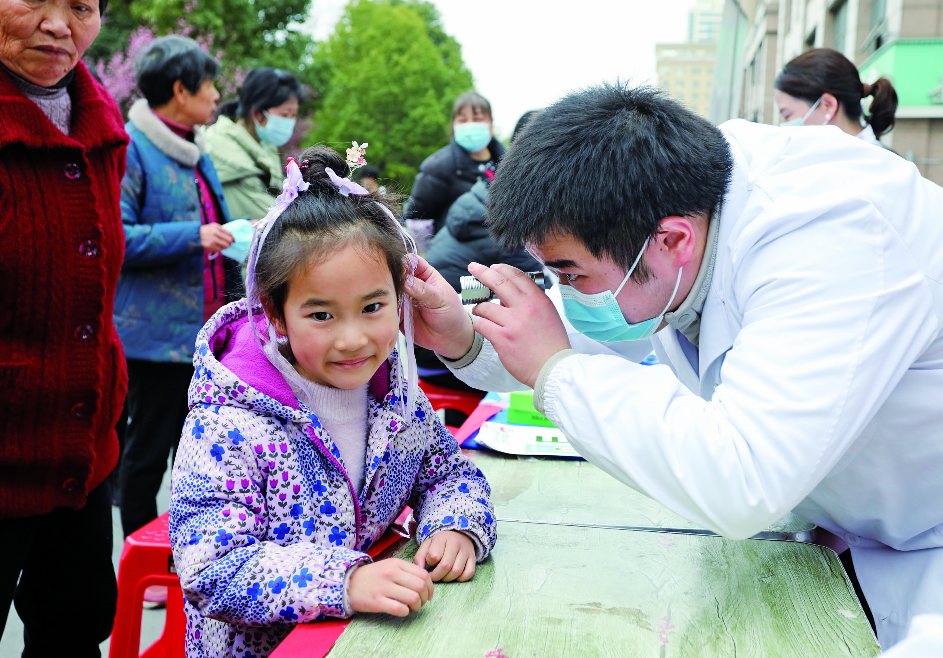 3月1日,在安徽省合肥市肥西县上派镇四十埠社区开展的爱耳日义诊进小区活动现场,医生为一名小朋友进行耳朵健康检查。 3月3日全国爱耳日来临之际,各地开展形式多样的主题活动,宣传爱耳护耳知识,关爱听力健康。 新华社发