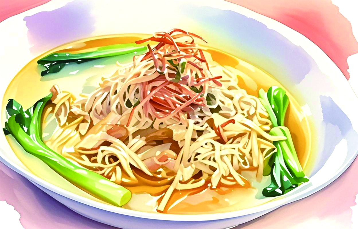 所谓干丝,就是豆腐干切丝,这道菜非常考验刀工,需要将豆腐干切成如发丝般细的干丝,加上高汤后,干丝充分吸收了汤汁的精华,变得更加柔软而富有弹性,品尝时可以感受到干丝在口腔中轻轻化开,再搭配上色泽红润、香气扑鼻的火腿丝,火腿的咸香与豆腐干的豆香交织,形成独特而诱人的香气。楚留香选火腿干丝,可见相当懂吃。