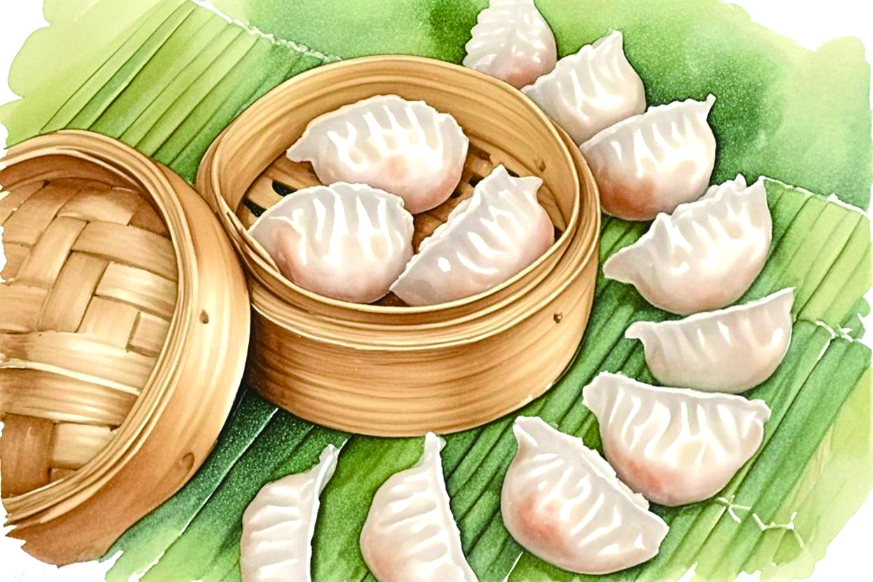 同样喜欢火腿的少年侠客还有《天龙八部》中的段誉。该书第十一章中,他来到姑苏慕容家,侍女阿碧请客人享用清茶糕点。四色点心是玫瑰绿豆糕、茯苓软糕、翡翠甜饼、藕粉火腿饺,形状精雅,每件糕点都似不是做来吃的,而是用来玩赏一般。段誉吃一件赞一件,大快平生。所谓的藕粉火腿饺,即用面粉和藕粉揉成晶莹透明的饺子皮,里面馅心是火腿丁和笋丁,火腿的咸香与笋丁的清脆相结合,为这道点心带来层次分明的口感。