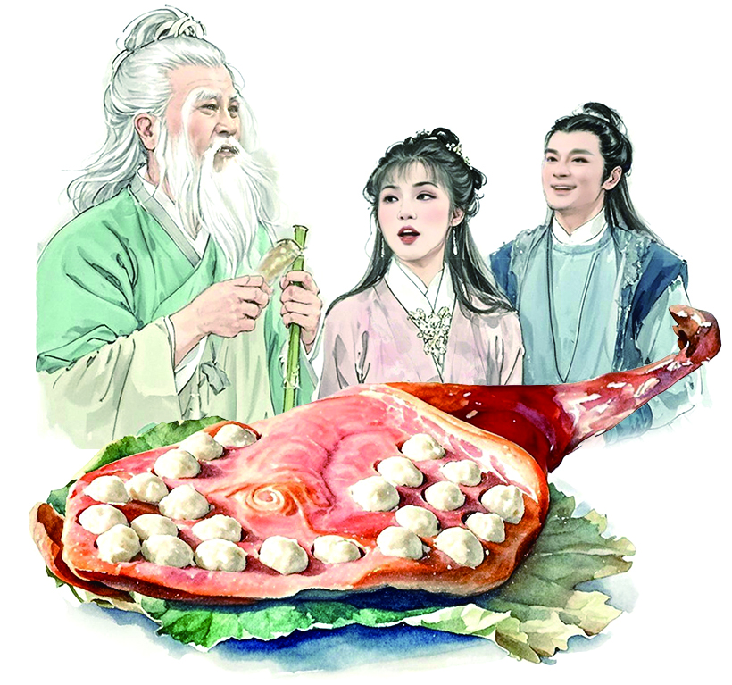金庸笔下的群侠中最喜欢火腿的当数洪七公。这位金庸小说中头号美食达人,曾经因为贪吃误事,砍掉了自己的一个手指头,自此成为“九指神丐”,却依旧改不了对美食的爱好。他不但爱吃,还很懂吃,能把各样菜肴里有什么食材说得头头是道。这样的美食家爱好火腿是很自然的。《射雕英雄传》第十二回提到,在吃完“二十四桥明月夜”第二天,黄蓉又做了三色小菜,洪七公手拿一只火腿脚爪慢慢啃着,跟黄蓉讲起了过去的事情……火腿吊挂发酵时,火腿脚爪处在上部,油脂和盐分都向下流动,所以火腿脚爪部位盐和油含量不高,骨头多、胶质多、肉少,滋味浓郁,适合慢慢啃。懂得吃火腿脚爪,正是老饕的表现。