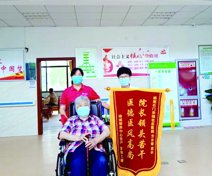 2020年6月30日下午,开发区石门农场社区卫生服务中心门诊大厅里上演了温馨的一幕。一位老奶奶坐在轮椅上,在绿城颐养中心护工的帮助下,把写有“院长领头苦干 医德医风高尚”字样的锦旗递交到主持工作的方云晓手中,对她的上门服务表示感谢。