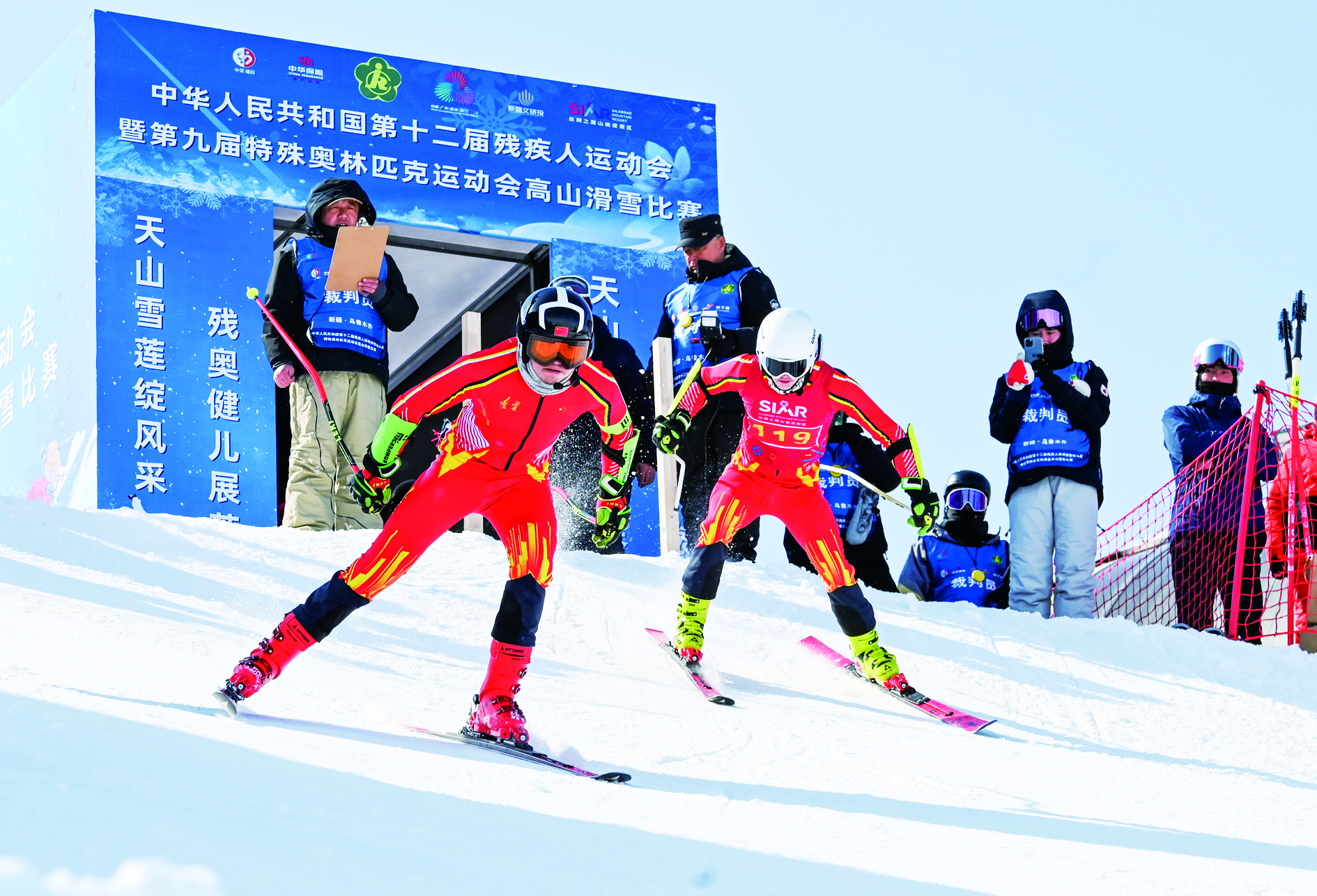 3月5日,辽宁省代表队选手董一恒(前右)和领滑员阿依波力·哈那提(前左)在男子视障组滑降比赛中。最终他获得本组别第二名。 当日,中华人民共和国第十二届残疾人运动会暨第九届特殊奥林匹克运动会(简称“全国残特奥会”)高山滑雪比赛在乌鲁木齐丝绸之路山地度假区拉开帷幕。 新华社发