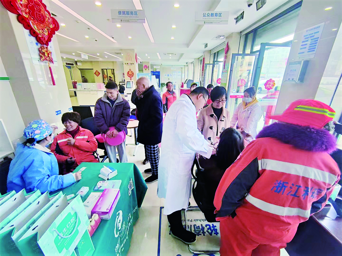 记者 王鹤之 文/摄 日前,金东区孝顺镇总工会组织金义仁康医院、瑞生口腔、易健堂等机构在成泰农商银行孝顺支行举办以“真情融驿站 义诊暖人心”为主题的义诊活动。 成泰农商银行孝顺支行是2025年市级民生服务站点。为更好地服务户外劳动者,孝顺镇总工会与该支行做好沟通衔接并预先做好宣传,让户外劳动者在安排好本职工作的前提下,到站参与义诊活动。 活动中,医疗义诊志愿服务团为户外劳动者进行血压测量、骨科疼痛检测、口腔检查、中医辨证诊疗等服务,对一些常见病、多发病、疑难杂症的治疗和预防给予指导,还普及了健康知识和健康生活方式,提供实用的健康小贴士。当天,共有80余名垃圾清运员、外卖员及部分办理业务的村民参与。