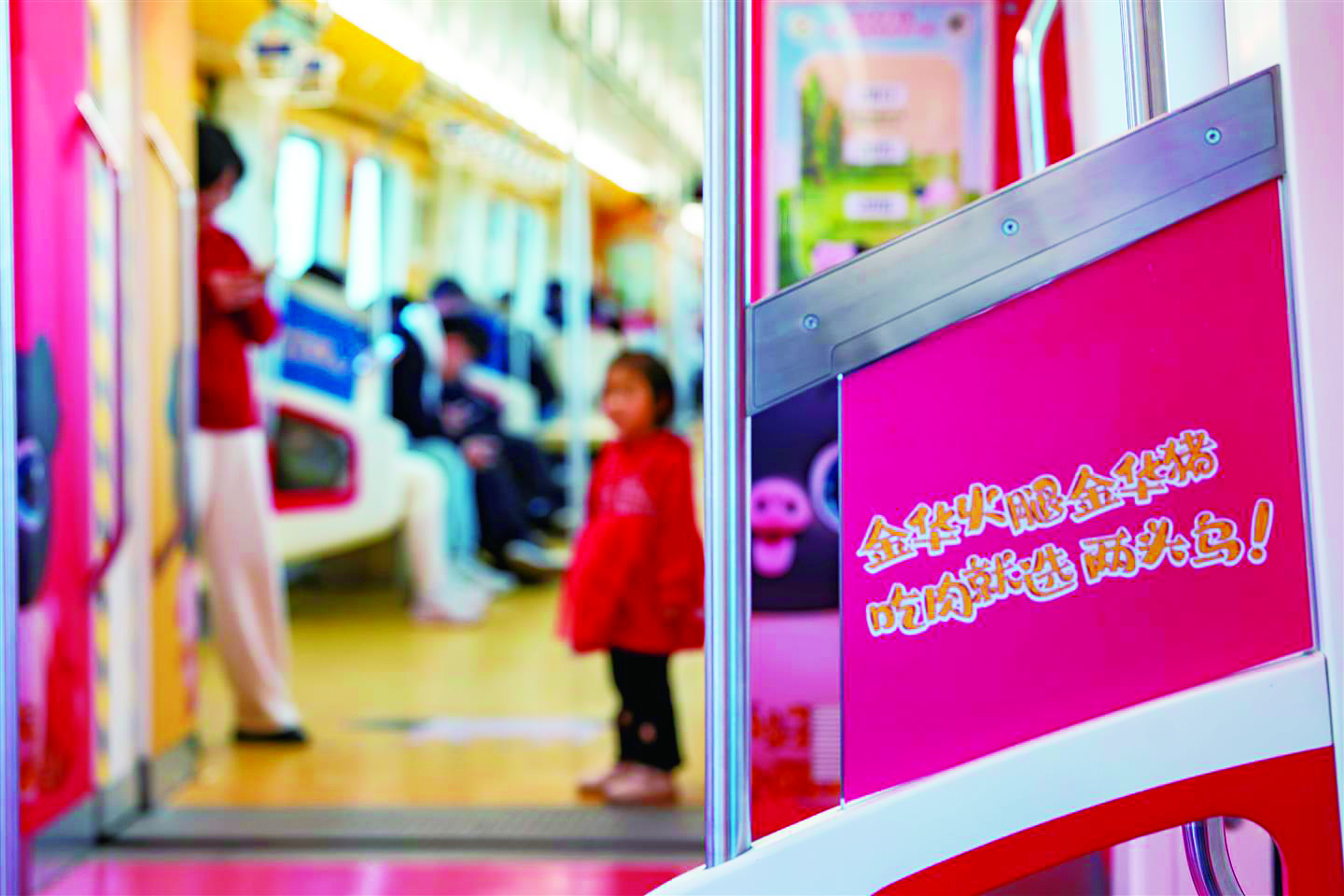 记者 陈业 文/摄 昨日,驶往义乌的轻轨上,一位母亲拿着手机给女儿和车厢内的“两头乌”文创广告合影。车厢内,一幅幅“两头乌”文创广告成为独具特色的城市风景线。