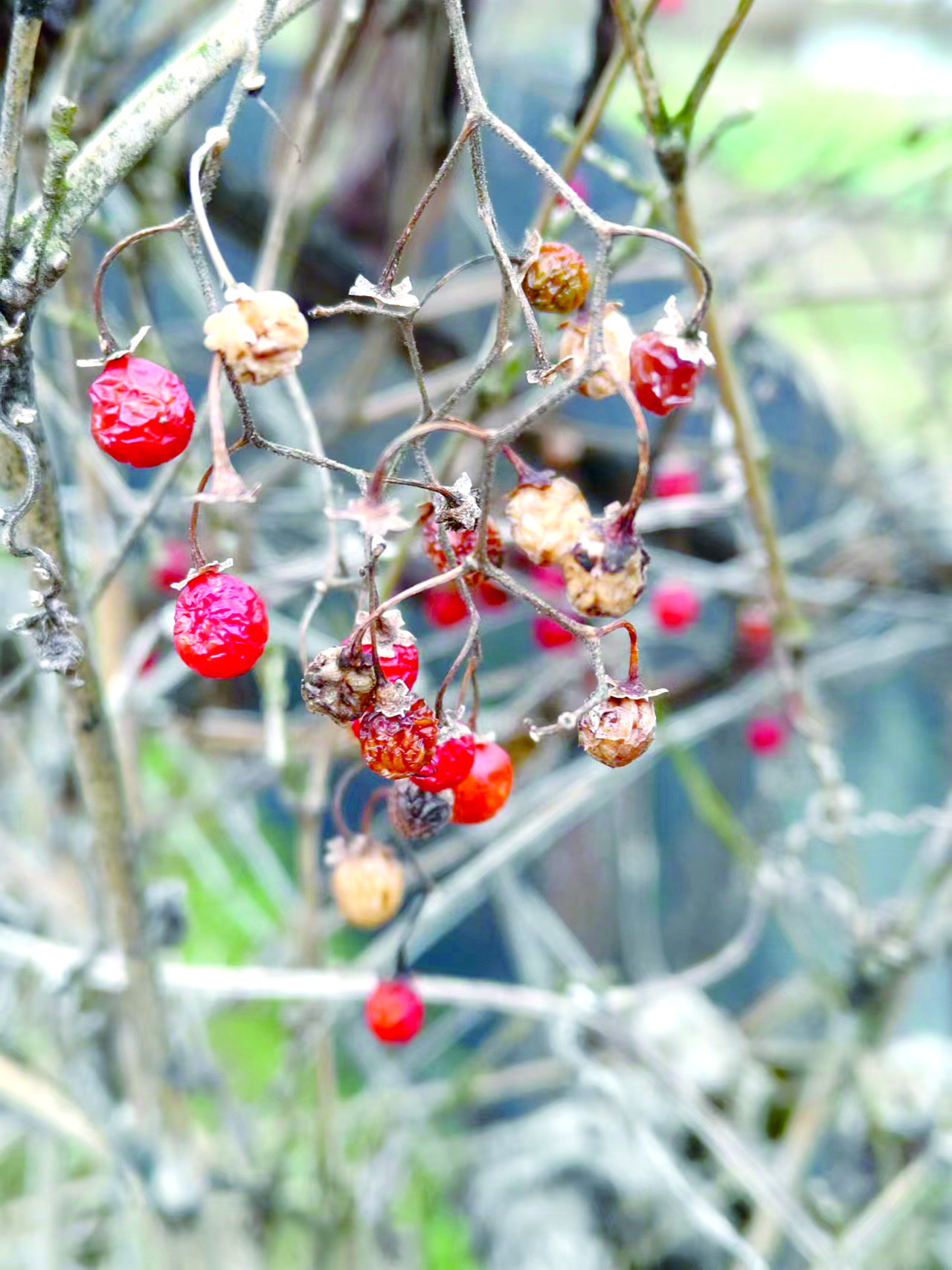 干瘪的浆果仍挂在篱笆上,残留着冬日的深褐。屋边的李子树抽出新芽时,田埂边的油菜花已开得金黄——枯荣更迭的痕迹,静静留在同一片风里。