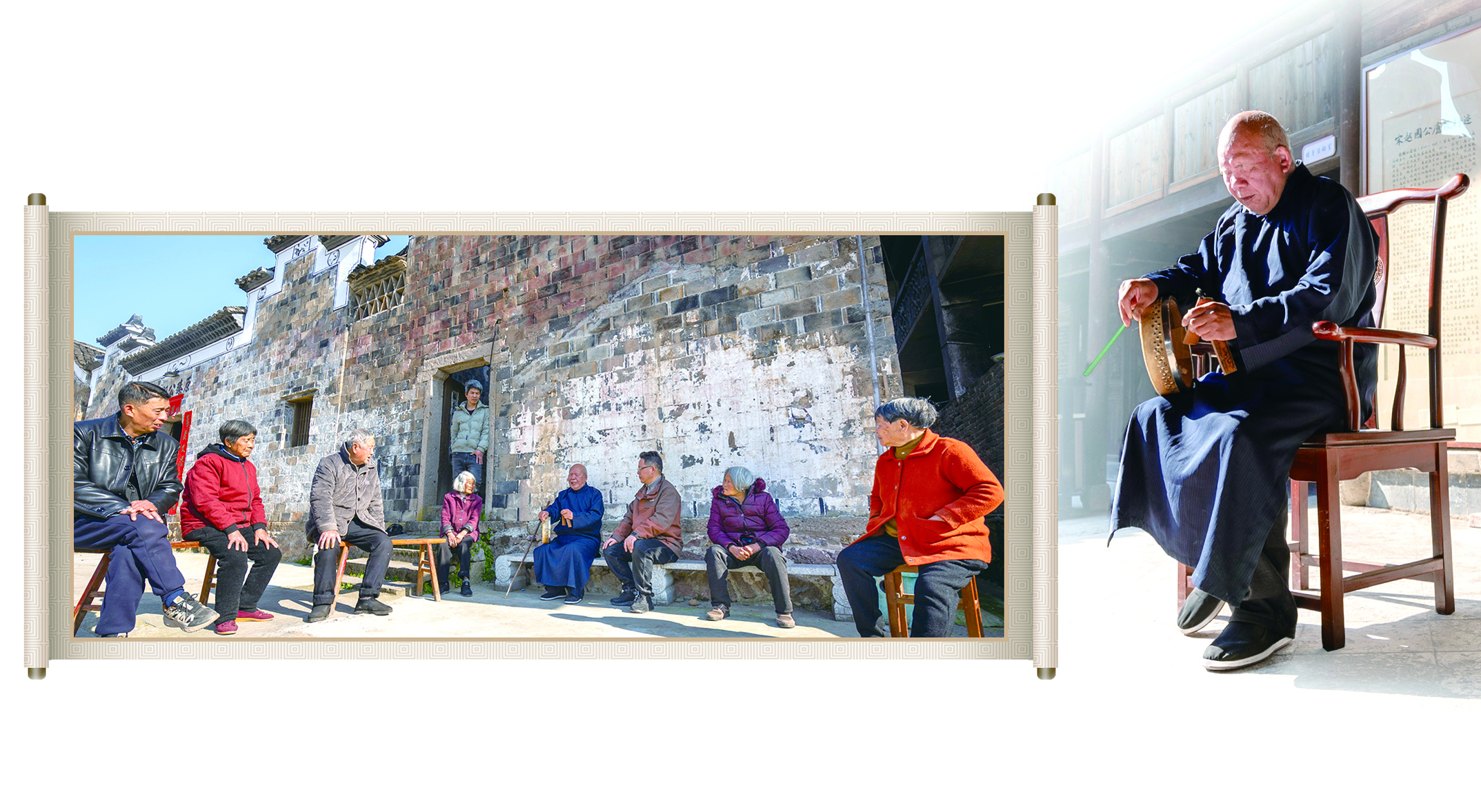 “来听鼓词咯。”卢顶风在唱鼓词时吸引了一群村民,他们搬出板凳,围坐在一边。