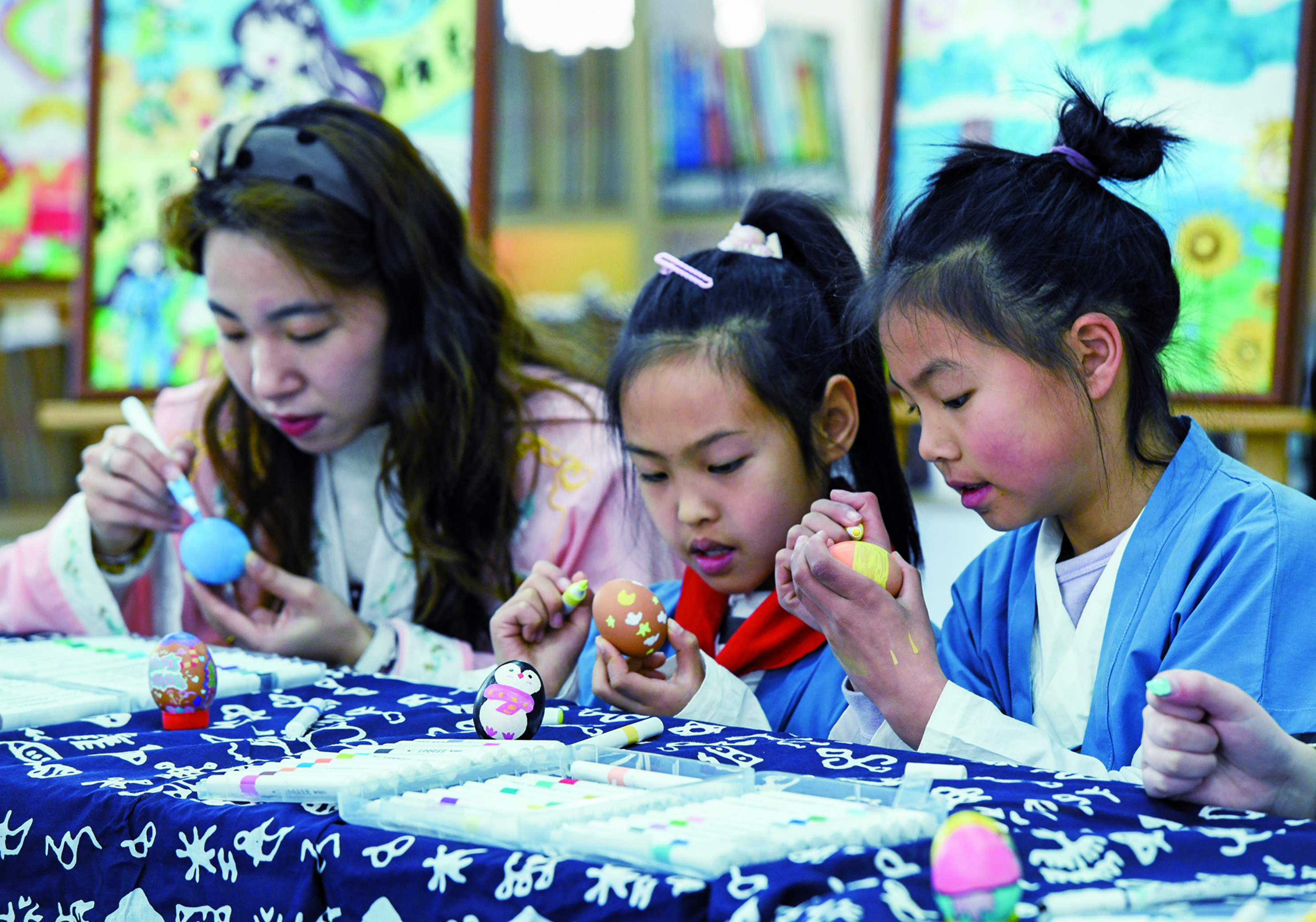 记者 时宽兵 文/摄 昨日,在婺城区一小学,老师和学生们身着传统服饰,开展“绘彩蛋 迎春分”主题活动。学生们踊跃报名参与“竖蛋大比拼”游戏,在互动中了解春分竖蛋的趣味习俗,感受传统节气文化。