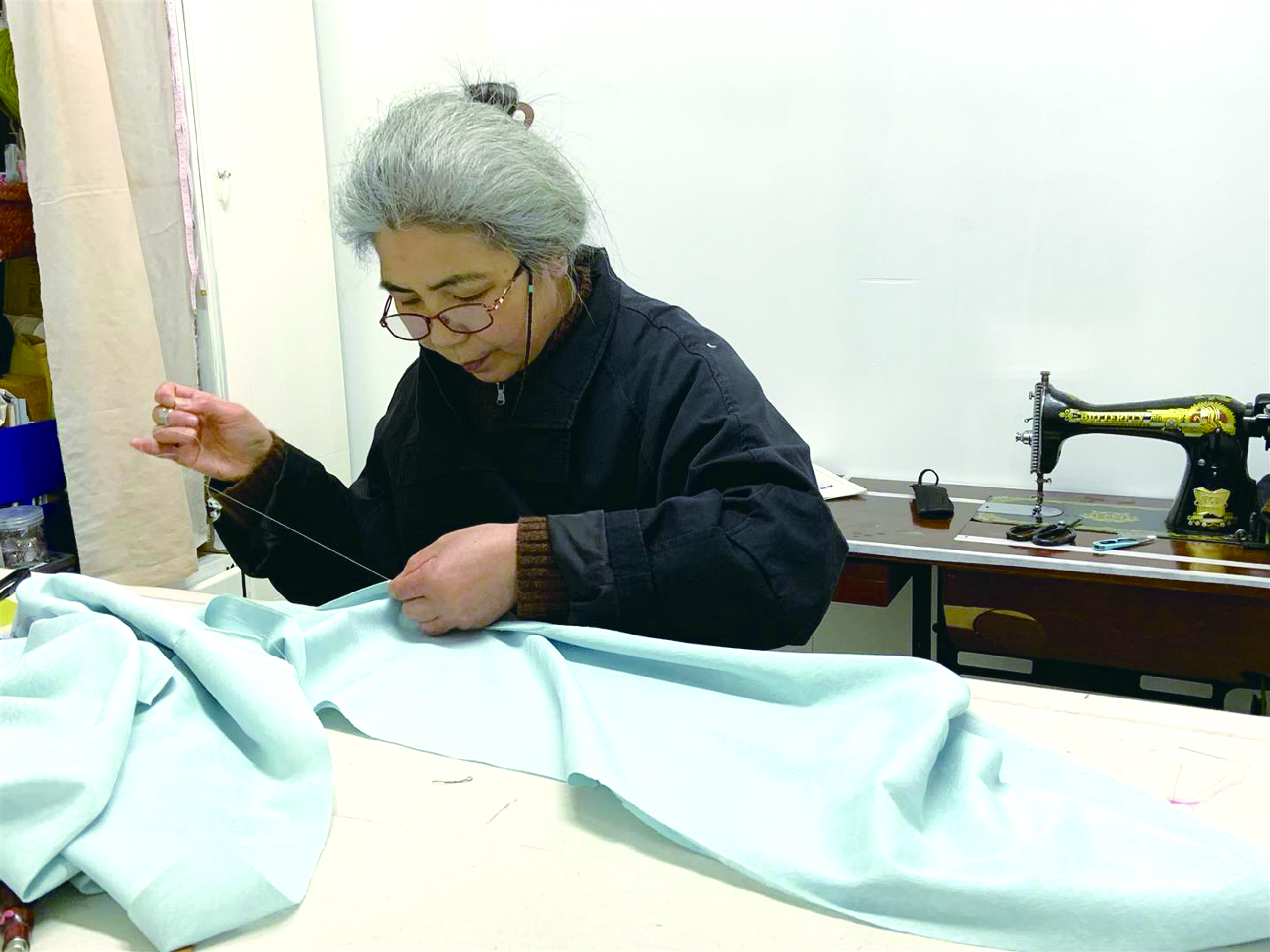 从小跟着父亲学艺,16岁进入裁缝行业,如今赵芳英已获得金华市工艺美术大师称号,是旗袍制作技艺金华市级非物质文化遗产代表性传承人。她和女儿俞璐的工作室把老一辈的匠心技艺传承下去,做客单之余,还坚持带好学徒。