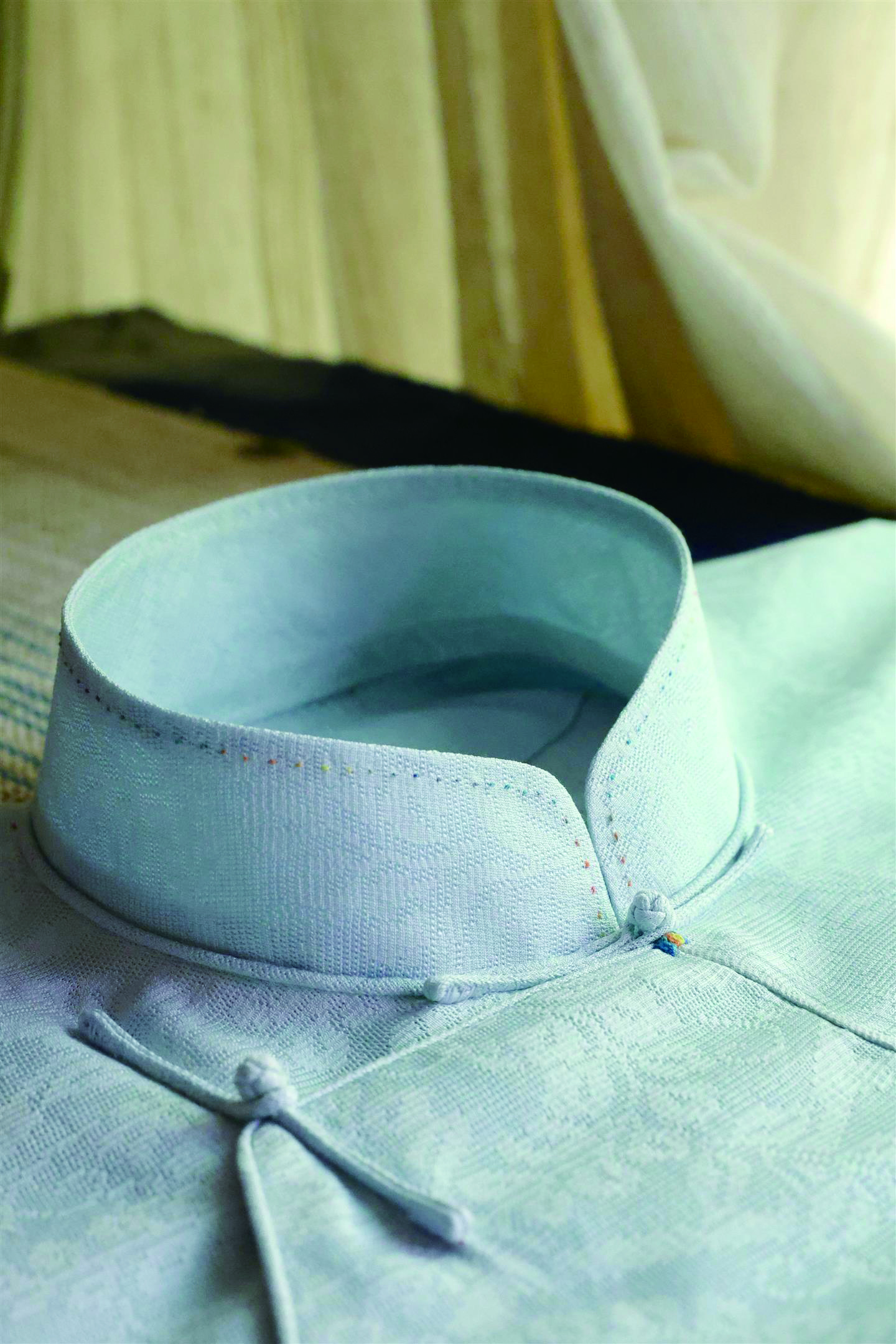 赵芳英翻出长衫里面,一整条黄鳝骨又细又长,完全看不到缝线的痕迹,“从正面看,或许能看到很少的小针眼,我们叫星点”。因为有花纹,制作这件长衫的黄鳝骨需要对缝,难度又提升了不少。长衫的领口采用了绲领托工艺,用了含蓄的针法看不到缝线,“传统工艺缝制的领子穿旧了、破了还能拆卸,换上新的再缝上去”。装领则用了针法缝出像编花一样的花形,使领子有灵动性,穿着也更舒适透气。赵芳英说自己是从父亲那里学得一些含蓄的针法。这些年,她在父亲传授的工艺上进行了提升,这件长衫的缝制更是秉承了精益求精的理念与原则,每个部位都追求细节,讲究“平、正、齐”,“做出来的不仅仅是件衣服,而是一件艺术品”。
