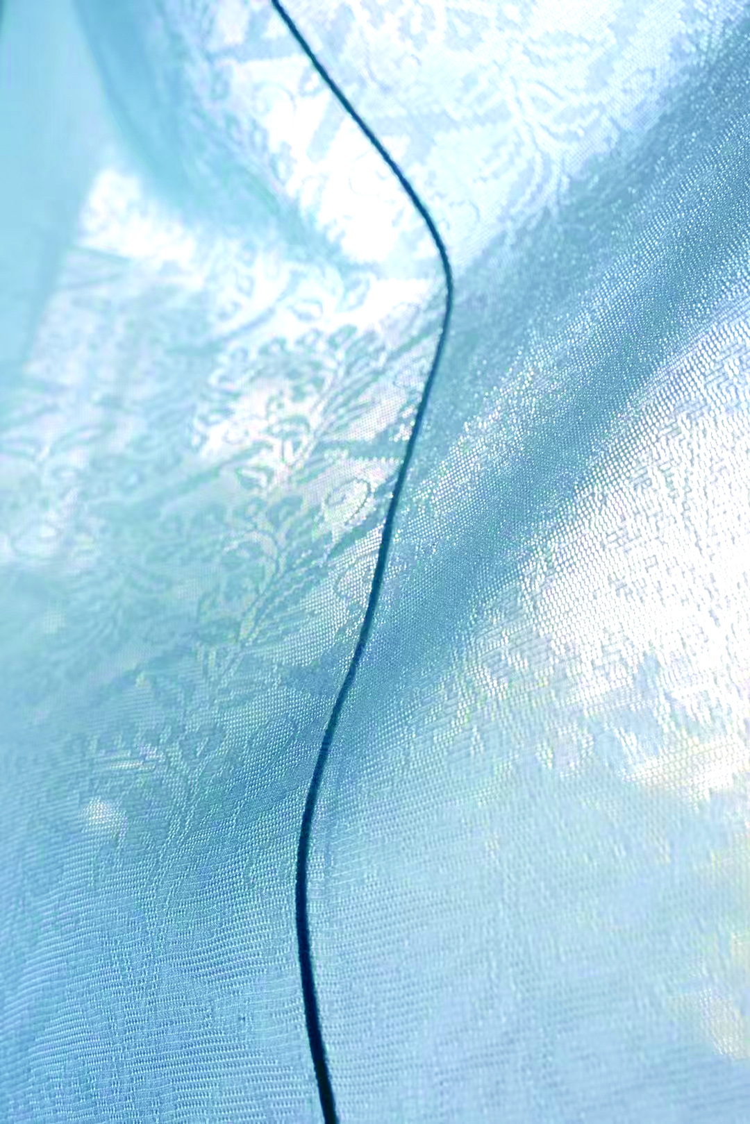 收到北京客人的好评,身在浦江的赵芳英露出了笑容。去年7月破例接的客单,赵芳英倾注了心血,时隔近8个月,近日终于完成从布料到衣服的嬗变。从丝线到织布、染色、裁剪、缝制,这件天青色的四经绞罗长衫制作完成何尝不是一段神奇的旅程呢?