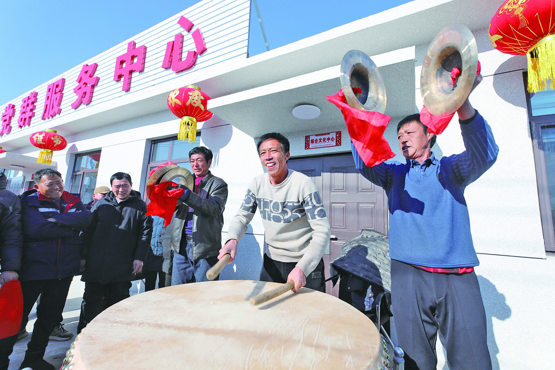 2025年1月28日,葫芦岛市绥中县明水满族乡祝家沟村村民在重建新房的村党群服务中心前鸣锣击鼓。2024年8月,葫芦岛市遭遇洪涝灾害,地势低洼的祝家沟村是受灾最为严重的乡村之一。新华社发