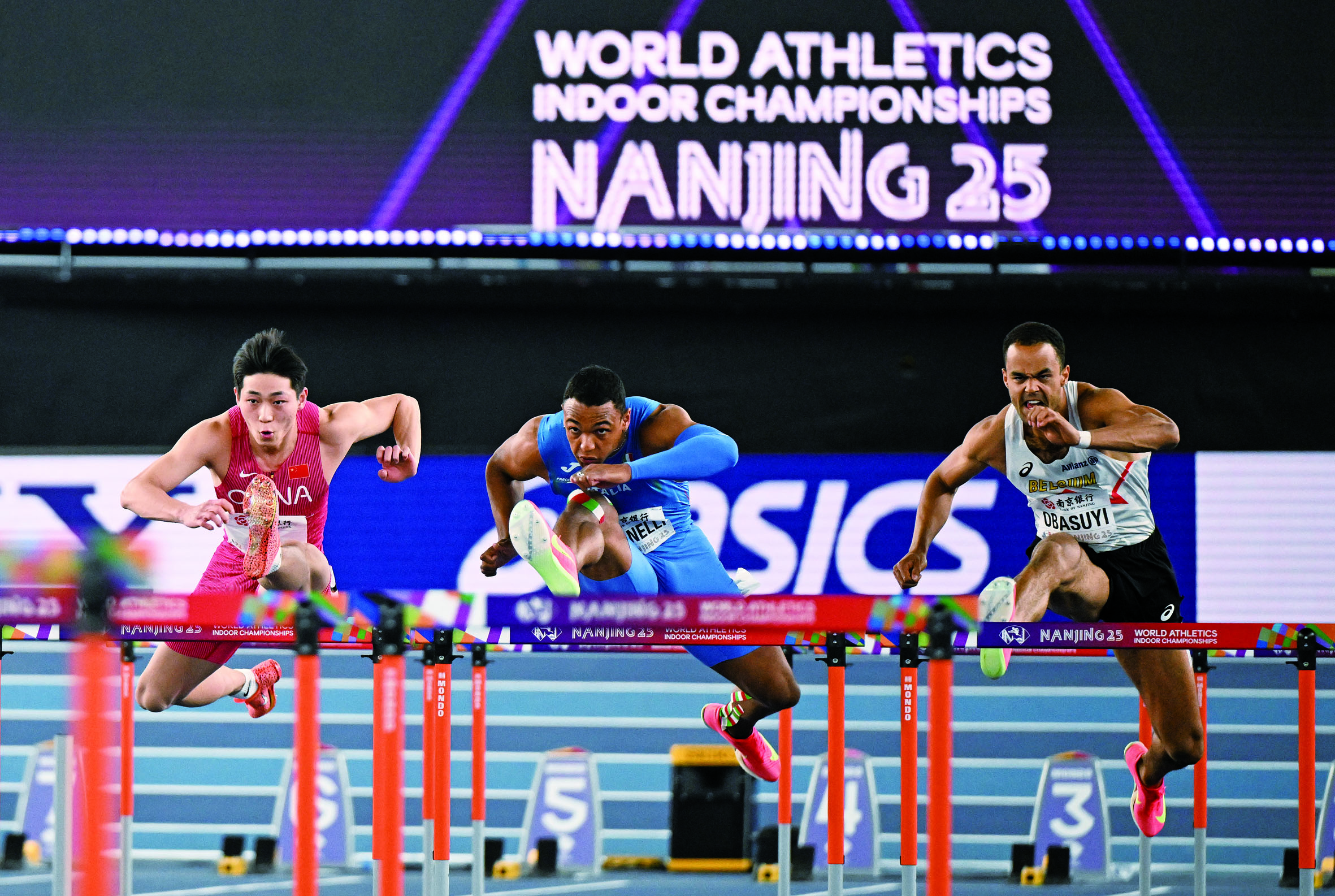 3月22日,中国选手刘俊茜(左)在决赛中。 当日,在2025南京世界田联室内锦标赛男子60米栏决赛中,中国选手刘俊茜获得季军。 新华社发