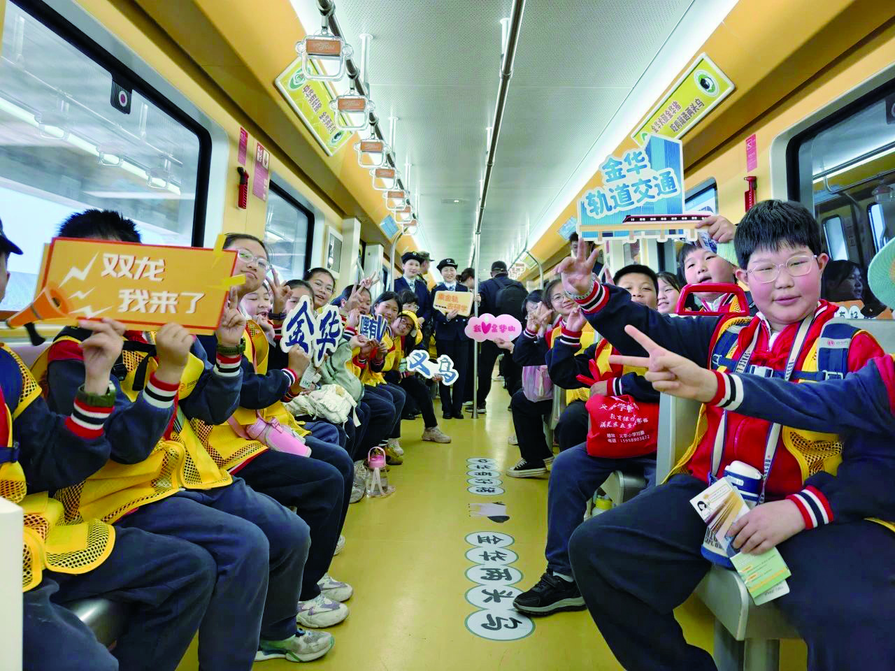 昨日,义乌畈田朱小学200多名师生乘坐“乘金轨去研学”专列到达轨道交通金华站,再转乘景区车辆前往双龙风景区开展研学活动。这是市轨道交通集团开通的首趟研学专列。