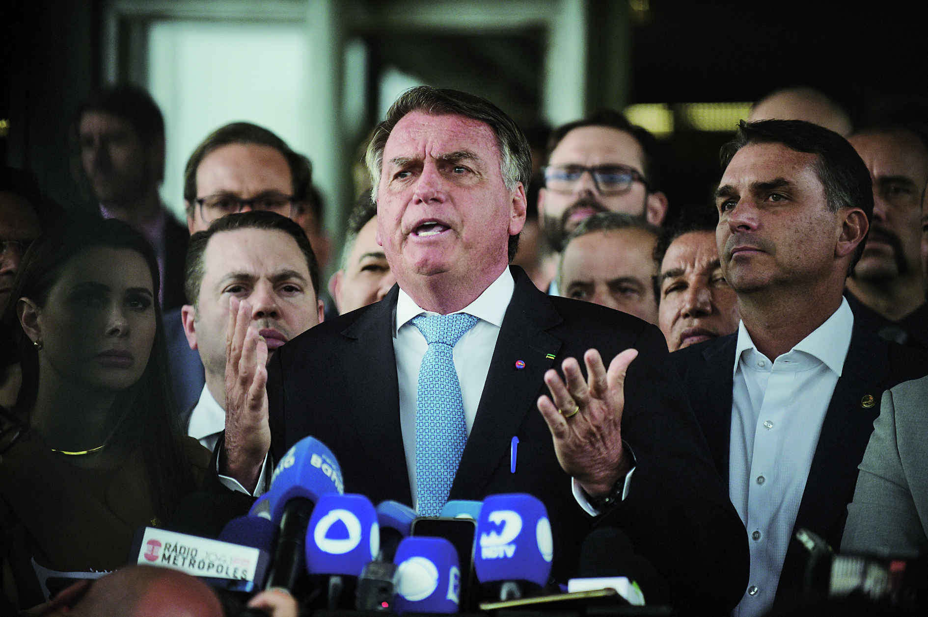 3月26日,在巴西首都巴西利亚,前总统博索纳罗(中)在参议院向媒体讲话。 新华社发