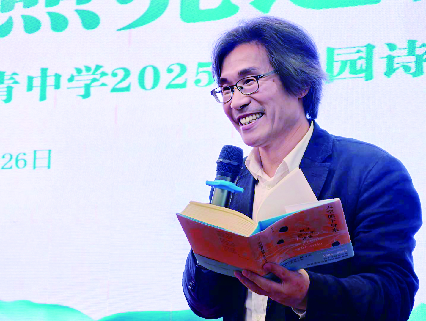 下午,学校举办诗歌创作讲座,特邀诗人树才和木汀与师生分享创作心得。树才不仅深度解析艾青诗歌的艺术魅力和诗歌创作的本质,更带来一份特殊心意——现场转达了艾青夫人高瑛对艾青中学师生的亲切问候。树才在讲座中即兴朗诵高瑛诗作,并鼓励学生提笔创作:“艾青中学的学子,理应成为诗歌大地的播种者。”他说,“不管你们是选择理科专业还是文科专业,我觉得诗歌都会给你们的生活带来特别的色彩和丰富性,写诗是用语言帮助你表达的一种方式,不碰一碰会是人生的一大遗憾。”