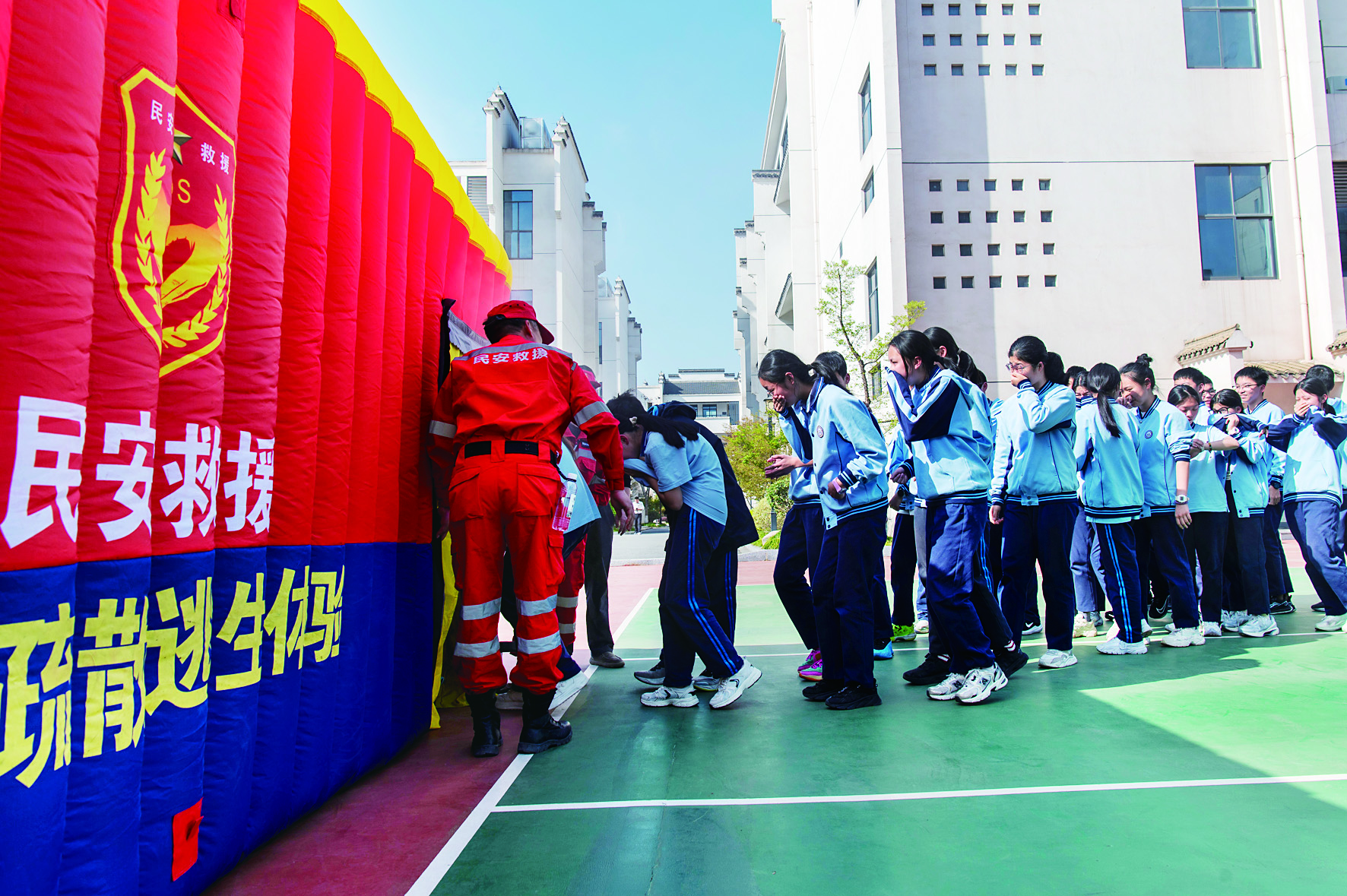 记者 胡肖飞 文/摄 3月24日,金华市丽泽中学操场上,救援组织人员指导学生开展疏散逃生演练。 随着“全国中小学生安全教育日”的临近,我市中小学校纷纷开展安全教育活动。