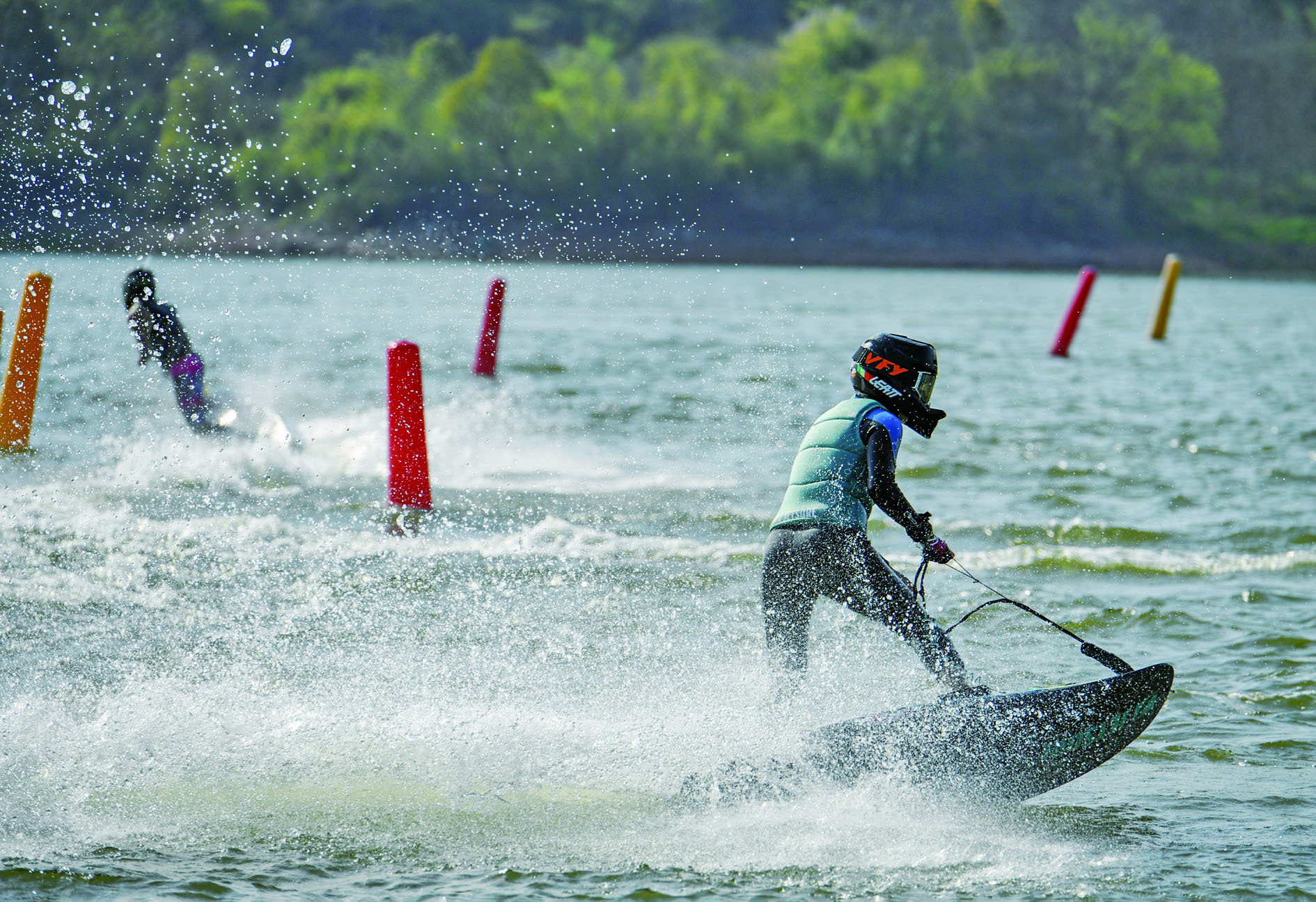 记者 时宽兵 文/摄 3月24日,在市郊长岭水库,金华市电动冲浪板队的队员们正在水面上加紧训练,备战2025年第12届世界运动会动力冲浪板比赛。 据了解,中国动力冲浪板国家队共有8名选手获得此届世运会参赛资格,其中有一名男队员和两名女队员来自金华队。这也是动力冲浪板首次进入国际综合性运动会并成为正式比赛项目。