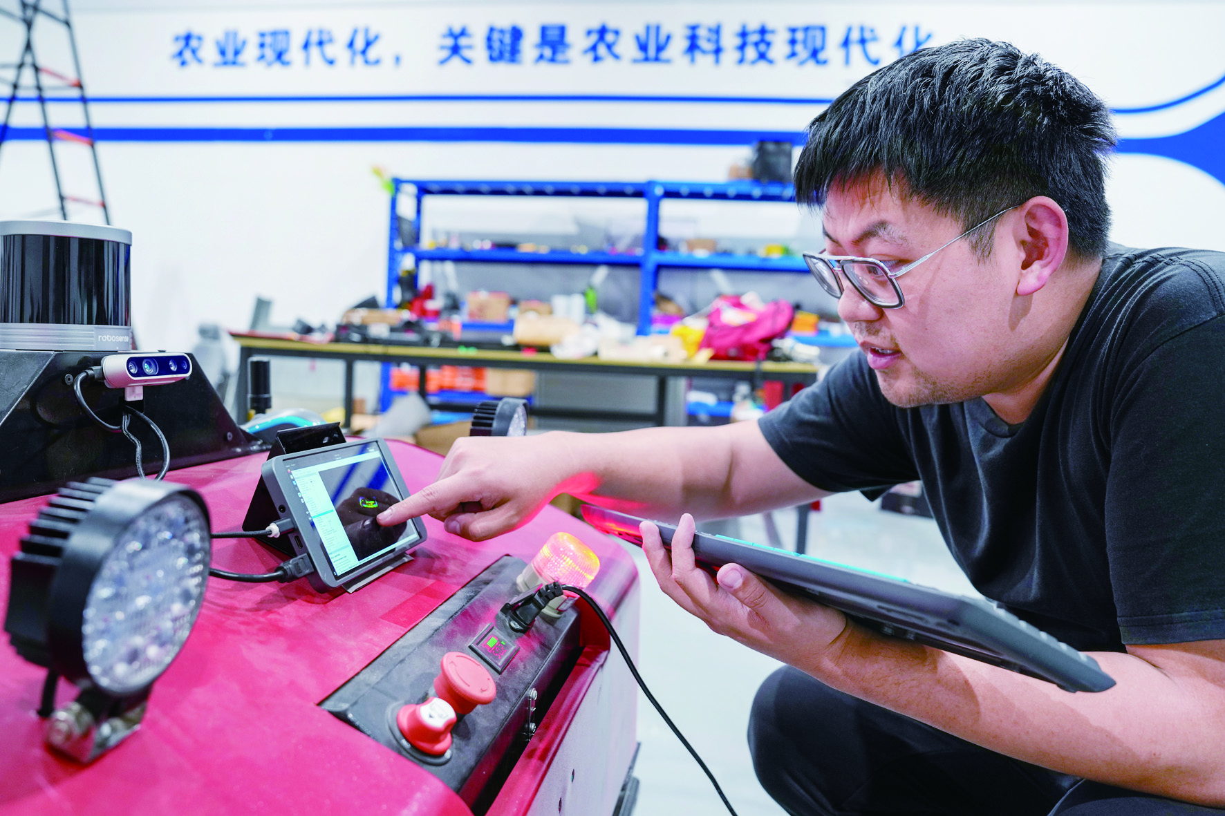 在中国农科院华东中心,耿博健在调试一台无人运输设备。 用北斗智能终端操作播种机、用土壤墒情传感器测算土壤肥料需求、空地一体化遥感监测车保障农田数据不间断……在江苏昆山陆家未来智慧田园,一群新农人们正以创新技术为犁铧、数字思维为种子,在田野上描绘着现代农业的新“丰”景。 在中国农科院华东中心,“90后”耿博健和智慧农业创新团队的小伙伴们通过写代码、做实验的方式,把新一代的信息技术与农业生产深度融合,他们运用5G技术和物联网技术,进行农田智能化、信息化改造,通过天空地一体采集温湿度、土壤墒情、虫情等农事数据,构建无人化智能农事作业平台,实现无人农场智能决策指挥和农事服务管理现代化。 当青春与乡土相遇,科技与农耕交融,“新农人”们以技术为翼、理念为舵、实干为帆,为农业现代化增动力、添活力。 新华社发