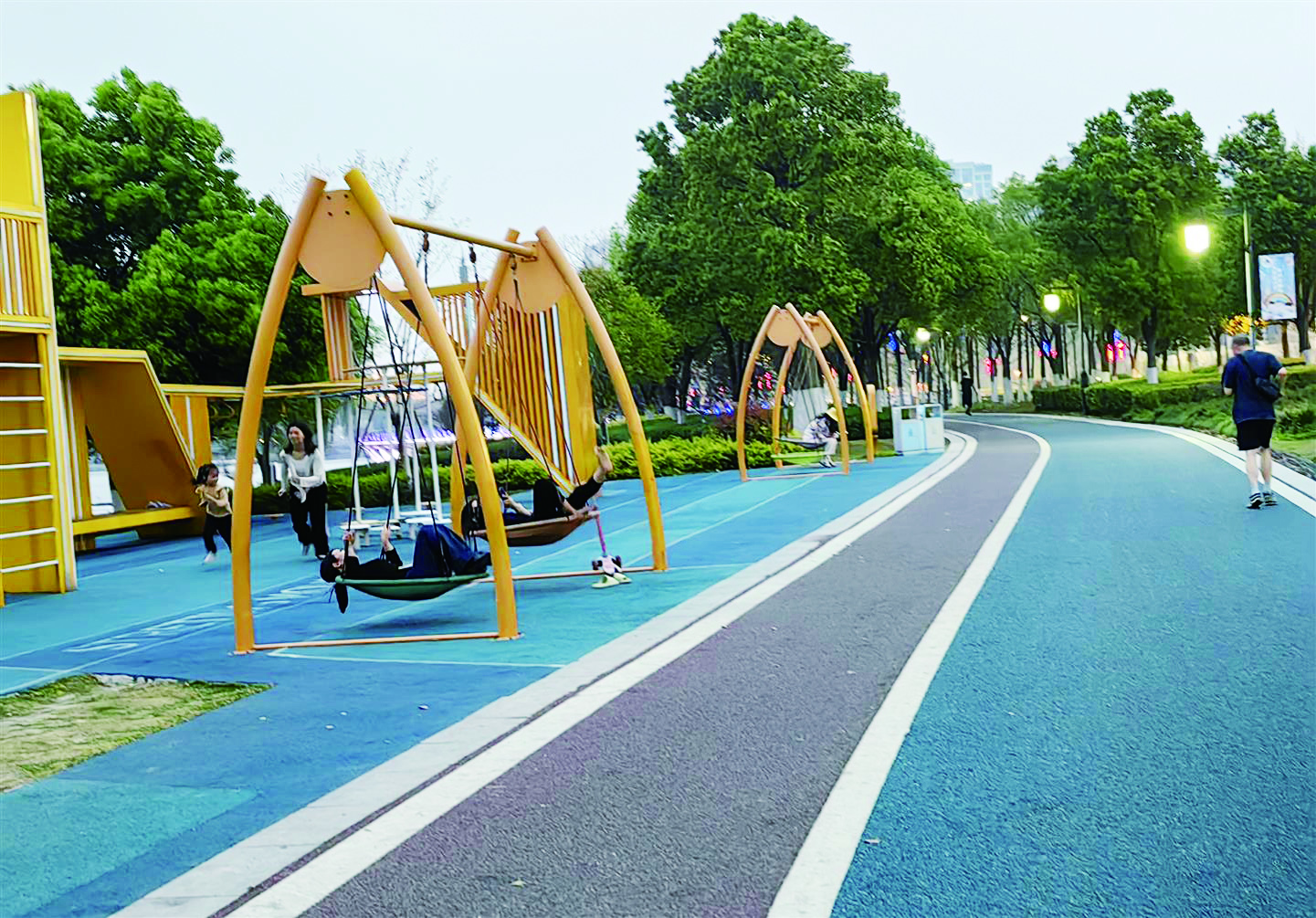中交城市投资(金华)有限公司相关负责人告诉记者,湖海塘公园运动休闲设施提升工程从休闲设施升级、健康场景构建、运动场地植入、基础设施提升等多维度进行提档,营造更嗨、更多彩、更动感的沉浸式运动场景。公园内,4.6公里彩色沥青跑道串联起五处迷你健身点,还充分利用现有草坪、林下空地布置游乐空间,新增各类趣味球场、一处无动力儿童乐园、一处风筝营地、一处欢乐草坡、一处平衡车游乐场、一处沙滩、一处门球场等特色区块,赋予公园鲜活的运动理念,为居民创造一个又一个放松身心、融入自然的运动休闲场所。这些散落在公园角落的便利设施,如同隐形推手,将“没时间、没场地”的偷懒借口逐个击破。