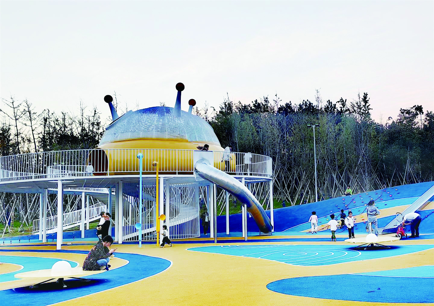 傍晚夕阳西斜时,湖海塘公园就开始热闹起来,人们从四面八方涌来。在公园东南角的无动力儿童乐园,市民周莉正带着5岁的儿子练习平衡车。彩色橡胶坡道让孩子在玩耍中锻炼肢体协调,“以前孩子幼儿园放学后大多窝在家里看动画片,现在吃完饭就嚷着要来‘闯关’。”周莉翻出手机相册,里面有儿子半年多的运动留影,“瘦了一点,人结实了,体质变好了”。这种变化,得益于公园设计师的巧思——将攀爬架伪装成童话城堡,用沙坑暗藏感统训练功能,让健康管理在游戏中自然发生。