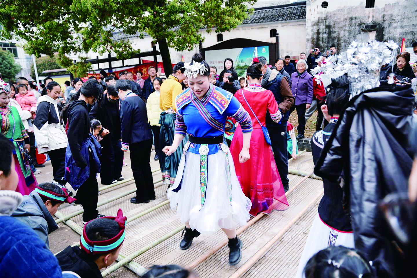 当天的鸽坞塔村人头攒动,彩旗飘扬,洋溢着喜庆祥和的氛围。舞台背景以畲族图腾和色彩织带为主,舞台两侧摆放手鼓等畲族传统乐器,现场充满浓郁的畲族风情。村口畲族姑娘身着凤凰装,手持彩带,唱响畲语迎客歌,向前来参加活动的宾客敬献“山哈酒”(茶)。竹竿舞互动区欢声不断,游客随韵律轻盈跃动。