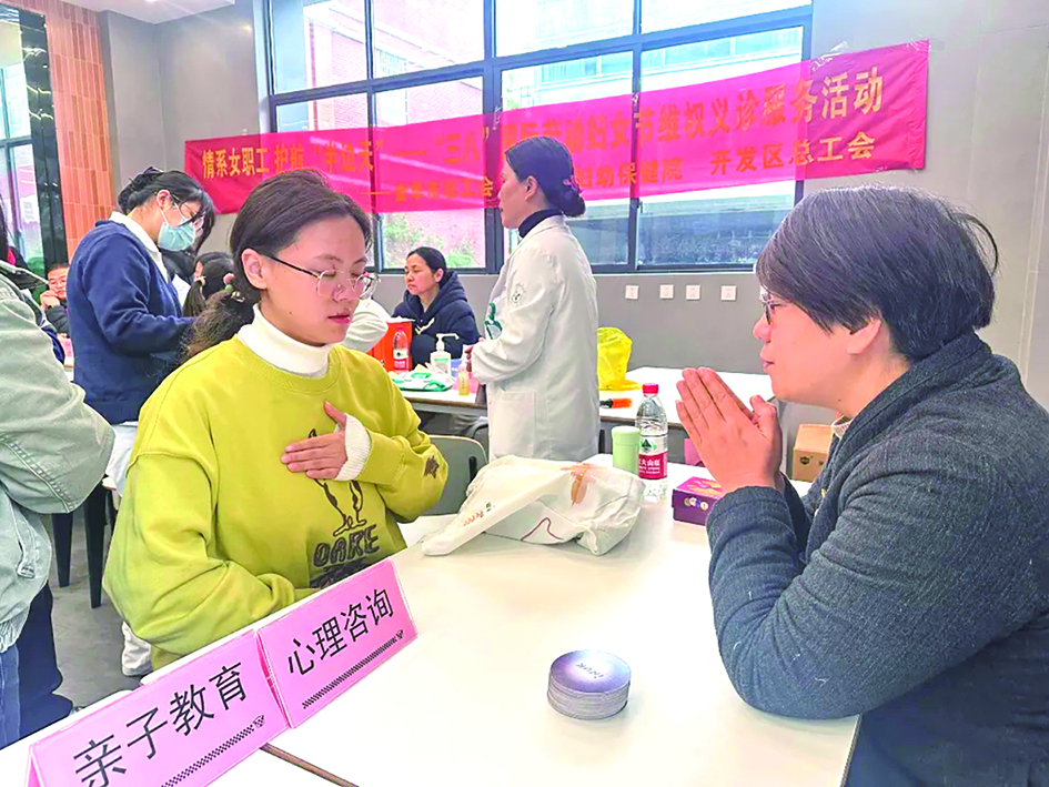 “怀孕期间可以享受哪些特殊权益”“在街边店买衣服回家后发现买贵了怎么维权”“替人担保结果自己被列入了黑名单怎么办”……在“法律咨询角”,女职工们依次咨询法律问题。来自浙江泽大律师事务所的律师团队针对问题一一解答,并提供切实可行的解决方案。而一旁的“心理疏导站”里,来自浙大研究院的心理咨询师夏丁玲正帮助女职工疏解郁结、释放压力。“不少姐妹抱怨爱人对家庭贡献少,我们给她们做心理疏导,并引导她们去沟通,还有一些姐妹倾诉职场性别歧视的困扰,我们通过案例模拟教她们依法维权。”夏丁玲说。