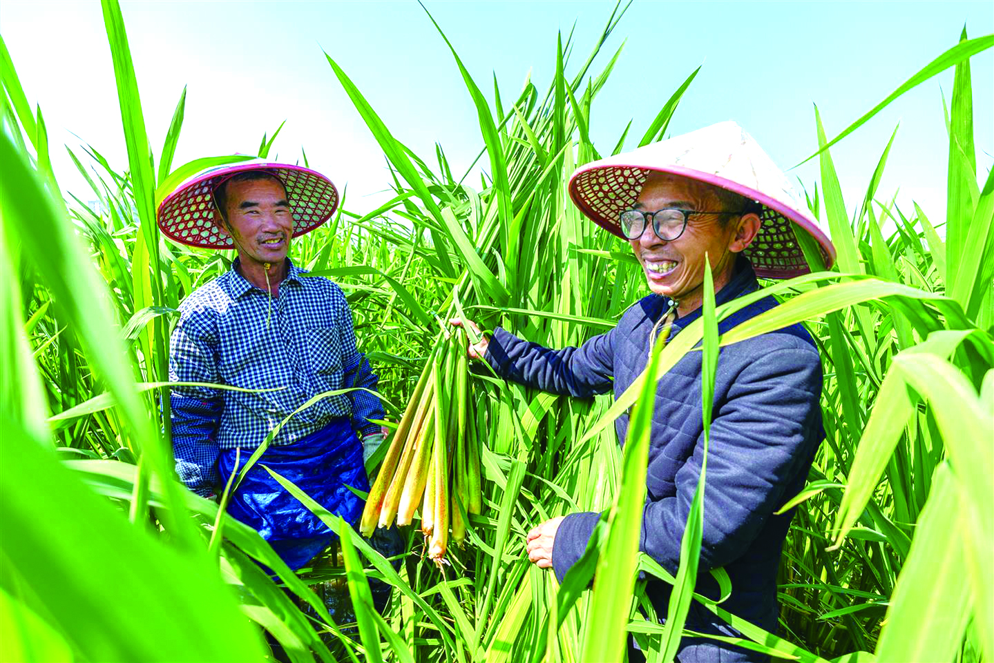 从传统选育到分子标记辅助育种,团队始终保持“土洋结合”的特色:既要分析基因序列,也要坚守清晨5时下田采花粉的“铁律”。“我们给每份种质建了‘电子身份证’,最终检验还得看田间表现。”杨梦飞翻着泛黄的观测记录本,上面密密麻麻记着10余年的试验数据。正是这样的坚守,让他们成功育成山区平原皆适宜的优质高产单季茭白“金茭4号”、早熟优质双季茭白“浙茭8号”、中熟优质双季茭白“浙茭3号”、晚熟优质双季茭白“浙茭10号”等新品种。单季和双季齐头并进、早中晚熟配套,有力地促进了国内茭白品种的更新换代,配套优质高效栽培技术和冷藏保鲜技术,实现茭白的周年供应。其中“浙茭6号”“浙茭8号”等5个茭白新品种先后入选浙江省主导品种,“浙茭3号”成为全国双季茭白主栽品种,在浙江、安徽、江苏、江西、福建、广东等省大面积推广种植。