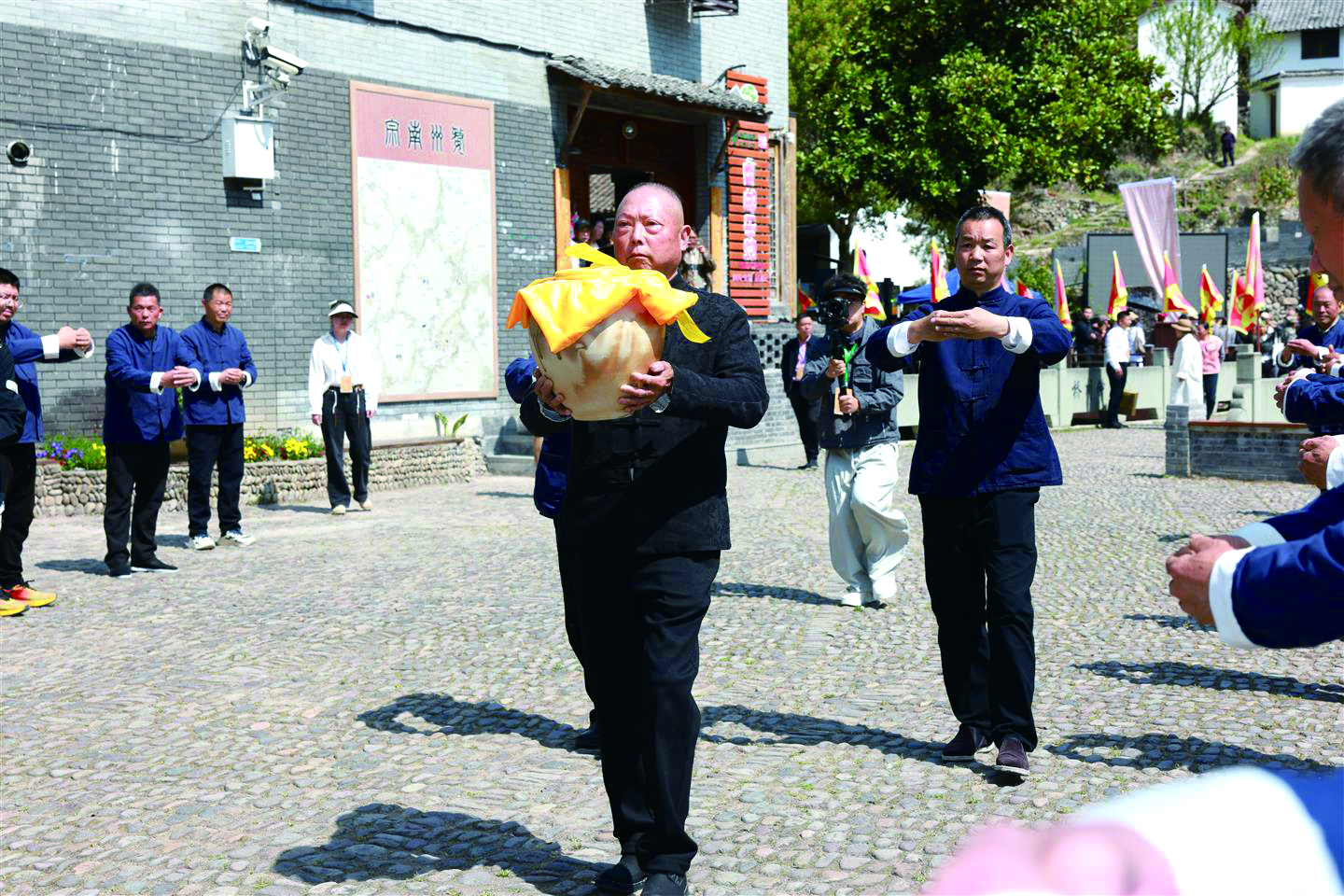 榉溪村孔氏后裔孔火春将陶罐捧在手中,从先师广场出发,跨过桂川溪上的石桥,走进孔氏家庙。这段路的距离并不长,孔火春眼神坚定,走得很稳。