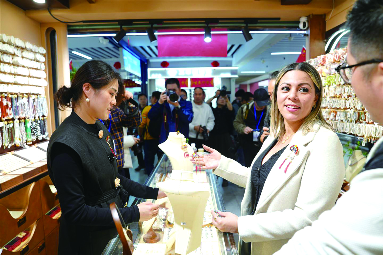 洪都拉斯客商在福多拉店铺试戴“国潮”饰品