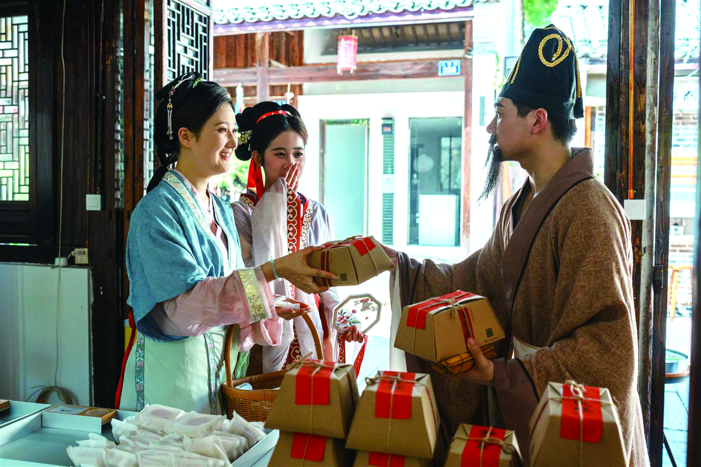 年轻人穿着汉服到网红店铺打卡