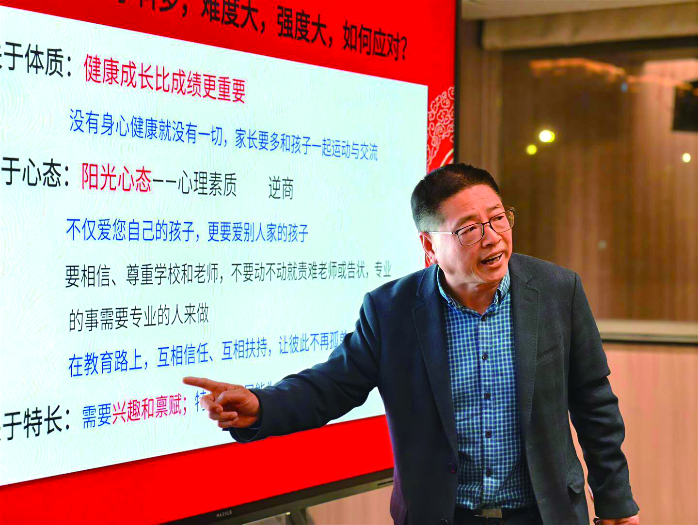 此外,童桂恒给出两大策略。其一,理性思考、合理定位。他从体质、心态、学习力、特长等方面支招:身心健康是首位,健康成长比成绩重要;心态要阳光,家长要引导孩子处理好同学关系,信任、尊重学校与老师;特长发展建立在孩子兴趣与禀赋之上,可为成长添彩;学习力涵盖创造力、专注力、观察力、记忆力、思维力等“五力”,其中专注力最关键,“让优秀成为习惯”则是培养专注力的秘诀。他讲述了一个学生凭借持续努力一步步迈向更高平台的故事,让家长体会更深刻。他还提出“懂”“会”“对”是不同学习阶段的观点,引发家长广泛共鸣。