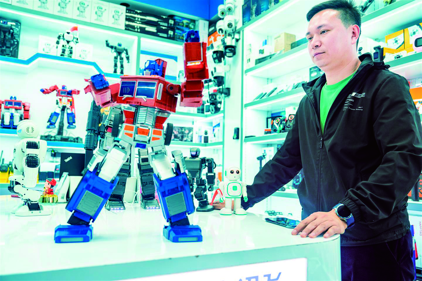 记者 傅俊 文/摄 昨日,在义乌国际商贸城一区,机器狗、变形金刚、多语种教学机器人等产品吸引不少采购商的注意。 “你好,擎天柱,变形!”在义乌市潇乐智能科技有限公司负责人李军的手机蓝牙控制下,擎天柱机器人开始表演中国功夫。“这款机器人有官方授权的,共有27个关节,通过编程,可以根据你的要求,组合出上千个动作。”李军店里的变形机器人,除了擎天柱,还有威震天,很快大黄蜂也会上市。 在日新月异的人工智能技术加持下,玩具行业正迎来一场智能化的变革,随着AI技术、物联网功能的融入,带有这些高科技元素的玩具正成为市场上的新宠。这些智能玩具不仅为孩子们带来了全新的互动体验,也是教育和娱乐相结合的新选择。