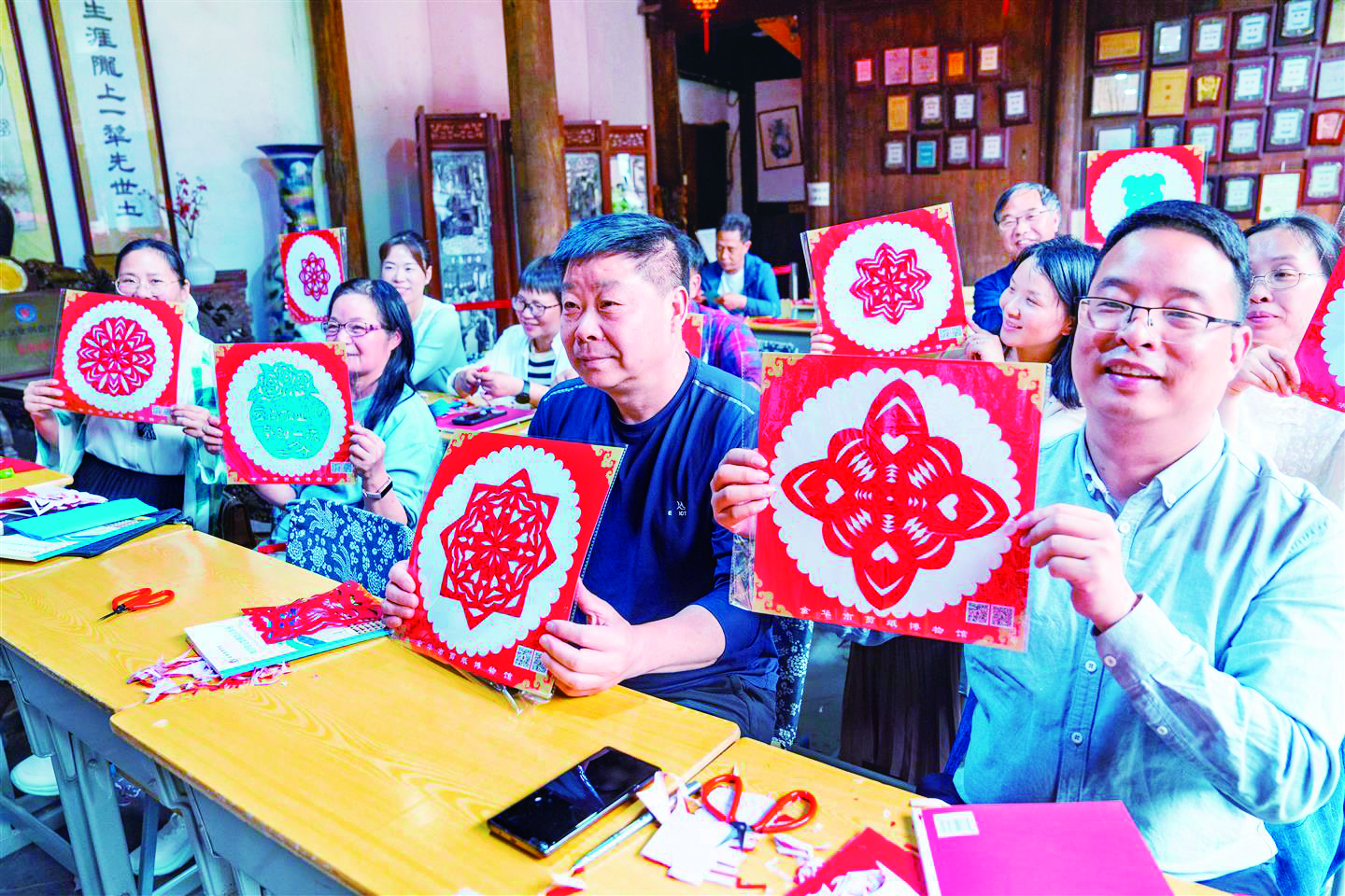 记者 傅俊 文/摄 昨日,在金华市剪纸博物馆,馆长詹东明给30余名来自各县(市、区)的校长和教师上剪纸课。 永康市芝英镇社区学校校长何家岳说,现在年轻人喜爱“国风国潮”,对非遗文化很感兴趣。 据不完全统计,金华市剪纸博物馆每年接待的国内外参观游客及本市市民达6万多人次。詹东明创作的剪纸作品被很多国内外友人收藏。