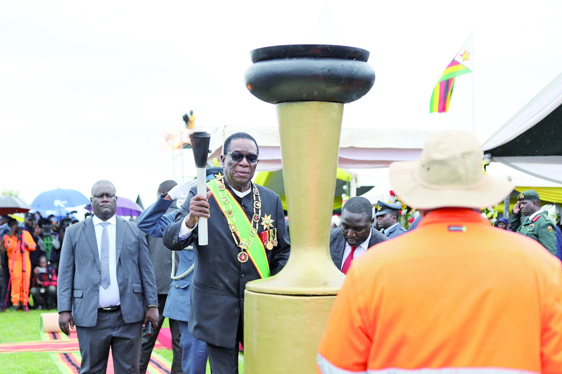 4月18日,在津巴布韦中部省举行的独立45周年庆典上,津巴布韦总统姆南加古瓦(前左二)准备点燃象征独立的火炬。 津巴布韦18日在中部省举行庆典,纪念该国摆脱英国殖民统治、实现独立45周年。 新华社发