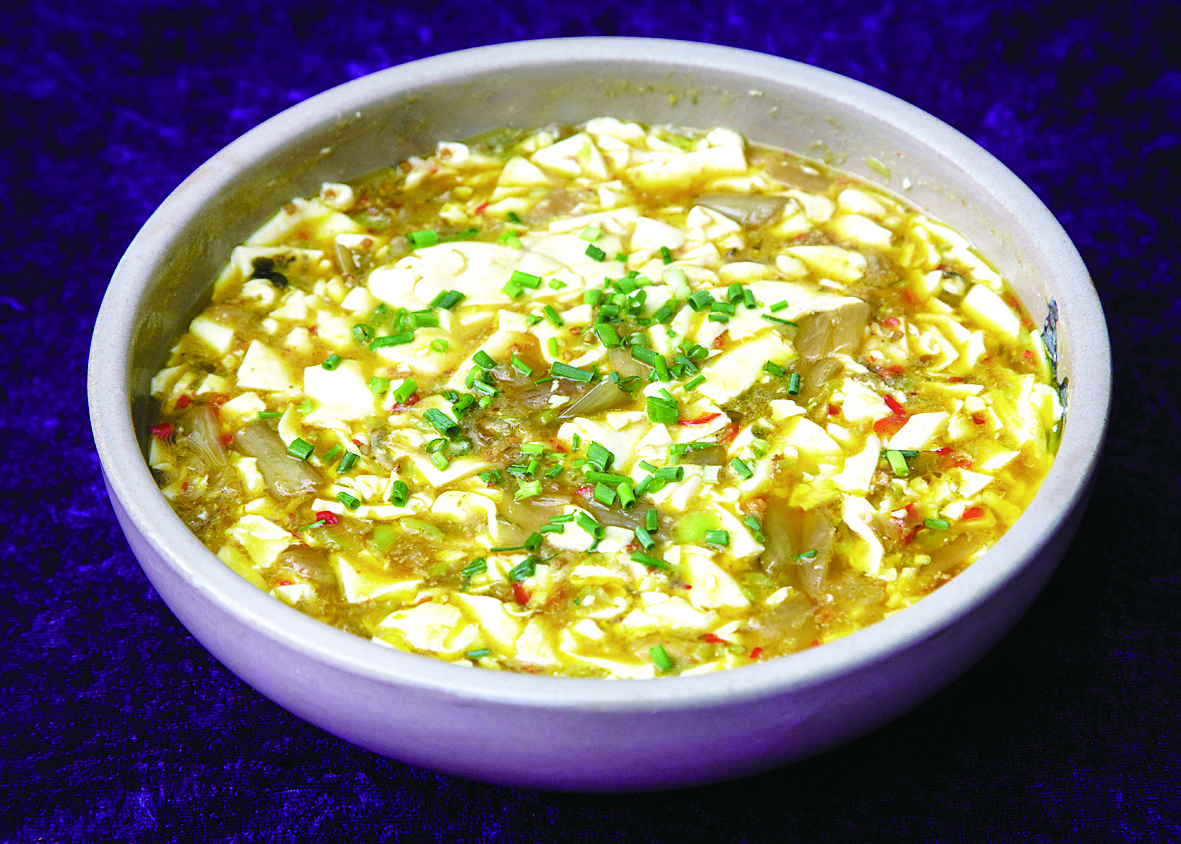 “很神奇,哪怕是老豆腐与烂菘菜一起煮,也会变得又嫩又滑。”提起汤溪菜,就不得不提闻起来臭、吃起来鲜的烂菘菜滚豆腐。先将菜籽油加热,再加入蒜、姜、辣椒等几样常见调料,炒出香味。紧接着倒入一碗腌制了一年以上的烂菘菜,与调料相互融合。接下来将盐卤豆腐切块下锅,与锅中配菜一起变得软烂入味。“烂菘菜滚豆腐,我们要把它素菜荤做,里面加入葱、姜、蒜、辣椒,最后起锅的时候要放猪油。”张胜华告诉记者其中的奥妙。