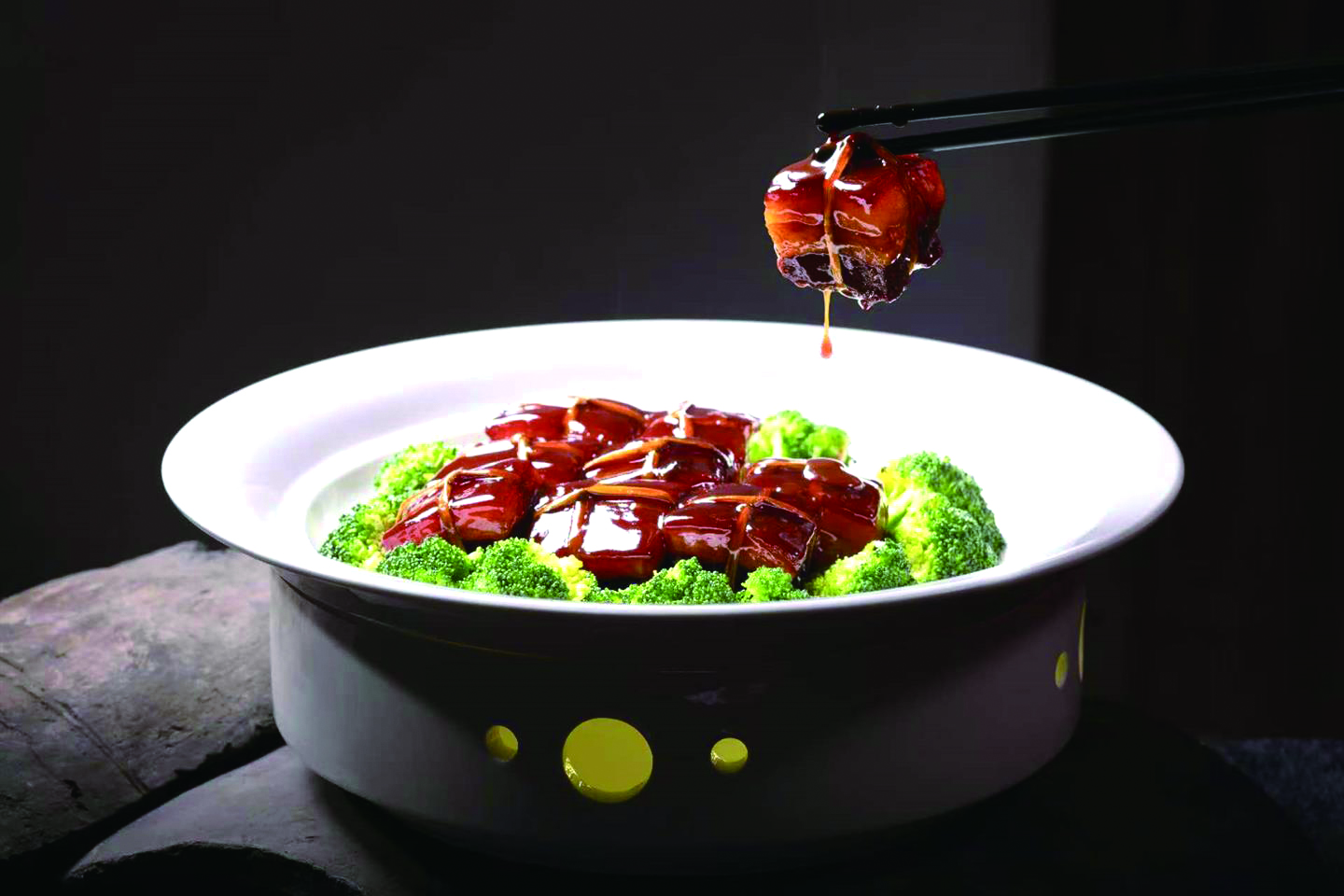 “我们用金华特产两头乌五花肉做原料,放入山泉水中煮至定型,并用当季新鲜稻草捆扎,搭配当地珍贵药材石斛,用特制酱汁调味,经过两小时的文火慢炖后收汁装盘。”