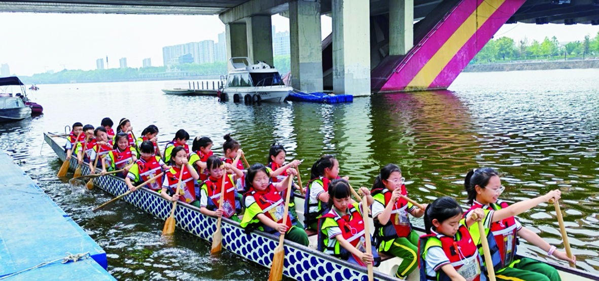 记者 方璟 文/摄 近日,金东区第二实验小学的孩子们来到金东区孝顺镇东上叶村和金华市龙舟训练基地,通过聆听村民讲赛龙舟故事,以及亲身体验划龙舟,沉浸式感受龙舟文化魅力。 东上叶村与龙舟关系密切,村里的叶姓族人因水而兴,赛龙舟是村里最重要的民俗活动之一。村民叶绍根家中至今保存着一支刻着“叶明德号”字样的明代龙舟划桨。1998年,该村成立龙舟队,打造了两艘木制龙舟,还特地购买了两艘符合国家龙舟比赛标准的龙舟进行训练。这支村级龙舟队曾获得“浙江省第四届农运会第四名”“2004年金华市龙舟赛荣誉奖”。如今,这四艘龙舟都摆放在该村的龙舟展示馆内。 当天,在金华市龙舟协会专业教练的悉心指导下,孩子们还学习了划桨的基本姿势和动作。来到市龙舟训练基地后,孩子们穿上救生衣,登上龙舟,体验划龙舟。 “划龙舟是中华传统文化运动,龙舟文化中的团结奋进精神将为孩子们注入自信与勇气。”金华市龙舟协会会长翁时文说,举办此次“婺里寻舟”活动,就是希望让更多孩子爱上龙舟,感受到传统体育竞技的魅力。